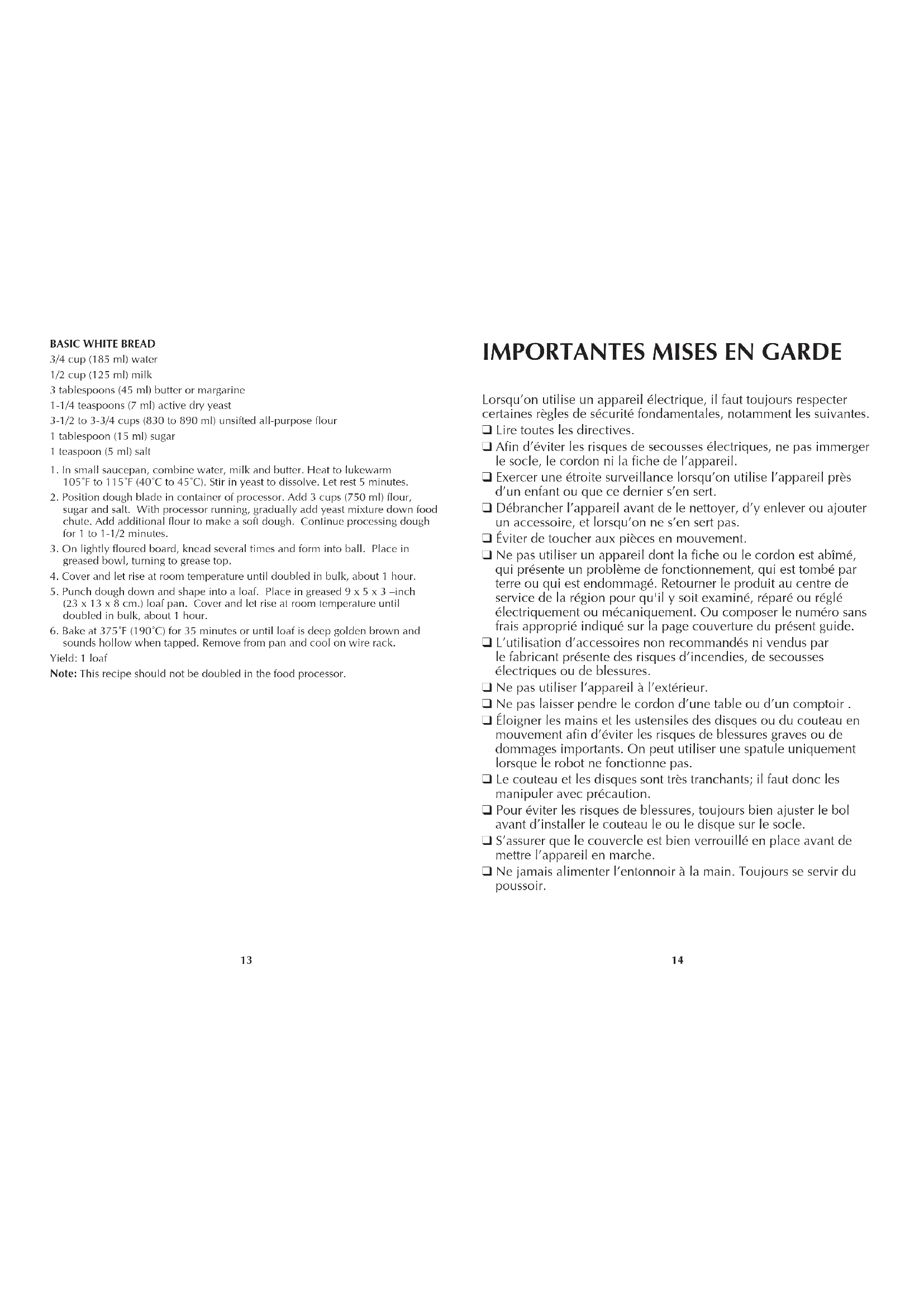 Lorsqu’on utilise un appareil électrique, il faut toujours respecter certaines règles de sécurité fondamentales, notamment les suivantes. q Lire toutes les directives. q Afin d’éviter les risques de secousses électriques, ne pas immerger le socle, le cordon ni la fiche de l’appareil. q Exercer une étroite surveillance lorsqu’on utilise l’appareil près d’un enfant ou que ce dernier s’en sert. q Débrancher l’appareil avant de le nettoyer, d’y enlever ou ajouter un accessoire, et lorsqu’on ne s’en sert pas. q Éviter de toucher aux pièces en mouvement. q Ne pas utiliser un appareil dont la fiche ou le cordon est abîmé, qui présente un problème de fonctionnement, qui est tombé par terre ou qui est endommagé. Retourner le produit au centre de service de la région pour qu'il y soit examiné, réparé ou réglé électriquement ou mécaniquement. Ou composer le numéro sans frais approprié indiqué sur la page couverture du présent guide. q L’utilisation d’accessoires non recommandés ni vendus par le fabricant présente des risques d’incendies, de secousses électriques ou de blessures. q Ne pas utiliser l’appareil à l’extérieur. q Ne pas laisser pendre le cordon d’une table ou d’un comptoir . q Éloigner les mains et les ustensiles des disques ou du couteau en mouvement afin d’éviter les risques de blessures graves ou de dommages importants. On peut utiliser une spatule uniquement lorsque le robot ne fonctionne pas. q Le couteau et les disques sont très tranchants; il faut donc les manipuler avec précaution. q Pour éviter les risques de blessures, toujours bien ajuster le bol avant d’installer le couteau le ou le disque sur le socle. q S’assurer que le couvercle est bien verrouillé en place avant de mettre l’appareil en marche. q Ne jamais alimenter l’entonnoir à la main. Toujours se servir du poussoir.