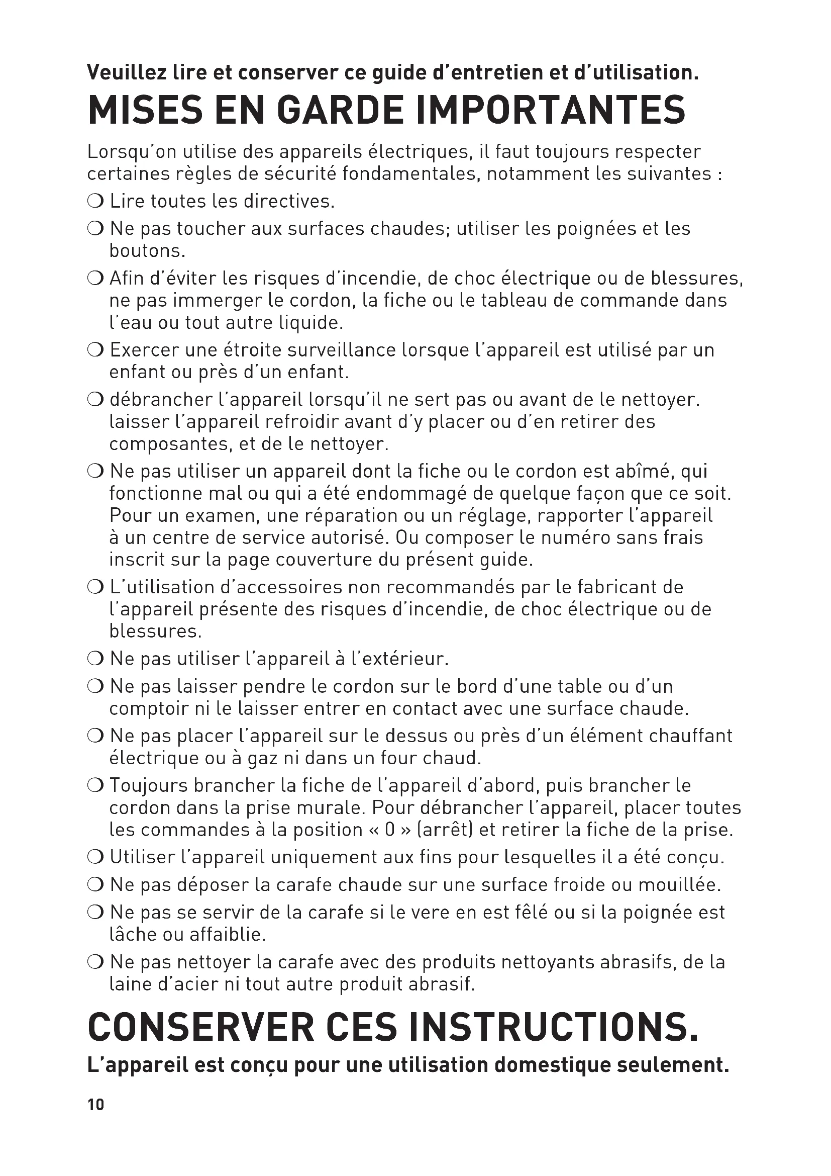 Lorsqu’on utilise des appareils électriques, il faut toujours respecter certaines règles de sécurité fondamentales, notamment les suivantes : ❍ Lire toutes les directives. ❍ Ne pas toucher aux surfaces chaudes; utiliser les poignées et les boutons. ❍ Afin d’éviter les risques d’incendie, de choc électrique ou de blessures, ne pas immerger le cordon, la fiche ou le tableau de commande dans l’eau ou tout autre liquide. ❍ Exercer une étroite surveillance lorsque l’appareil est utilisé par un enfant ou près d’un enfant. ❍ débrancher l’appareil lorsqu’il ne sert pas ou avant de le nettoyer. laisser l’appareil refroidir avant d’y placer ou d’en retirer des composantes, et de le nettoyer. ❍ Ne pas utiliser un appareil dont la fiche ou le cordon est abîmé, qui fonctionne mal ou qui a été endommagé de quelque façon que ce soit. Pour un examen, une réparation ou un réglage, rapporter l’appareil à un centre de service autorisé. Ou composer le numéro sans frais inscrit sur la page couverture du présent guide. ❍ L’utilisation d’accessoires non recommandés par le fabricant de l’appareil présente des risques d’incendie, de choc électrique ou de blessures. ❍ Ne pas utiliser l’appareil à l’extérieur. ❍ Ne pas laisser pendre le cordon sur le bord d’une table ou d’un comptoir ni le laisser entrer en contact avec une surface chaude. ❍ Ne pas placer l’appareil sur le dessus ou près d’un élément chauffant électrique ou à gaz ni dans un four chaud. ❍ Toujours brancher la fiche de l’appareil d’abord, puis brancher le cordon dans la prise murale. Pour débrancher l’appareil, placer toutes les commandes à la position « 0 » (arrêt) et retirer la fiche de la prise. ❍ Utiliser l’appareil uniquement aux fins pour lesquelles il a été conçu. ❍ Ne pas déposer la carafe chaude sur une surface froide ou mouillée. ❍ Ne pas se servir de la carafe si le vere en est fêlé ou si la poignée est lâche ou affaiblie. ❍ Ne pas nettoyer la carafe avec des produits nettoyants abrasifs, de la laine d’acier ni tout autre produit abrasif. CONSERVER CES INSTRUCTIONS. L’appareil est conçu pour une utilisation domestique seulement.11 FICHE POLARISÉE (MODÈLES 120 V SEULEMENT) Cet appareil est doté d’une fiche polarisée (l’une des broches est plus large que l’autre). Afin de réduire les risques de chocs électriques, la fiche se branche dans une prise polarisée dans un sens seulement. Si la fiche n’entre pas complètement dans la prise, tourner la fiche. Si la fiche n’entre toujours pas, communiquer avec un électricien qualifié. Ne pas tenter de modifier la fiche. VIS INVIOLABLE