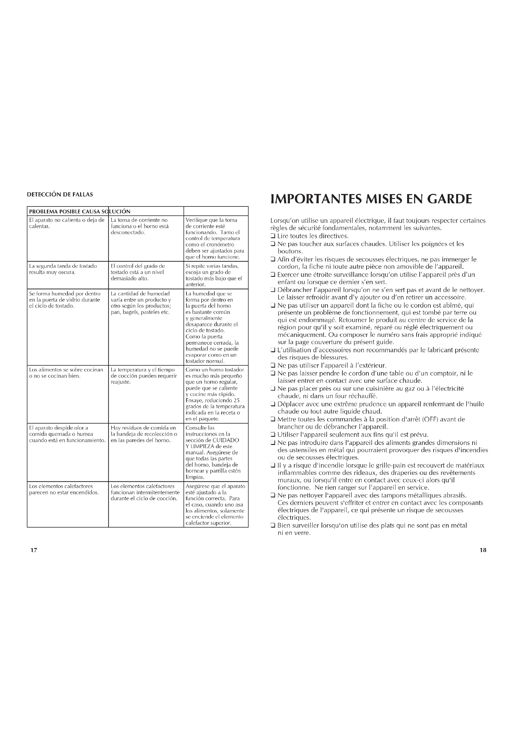 Lorsqu’on utilise un appareil électrique, il faut toujours respecter certaines règles de sécurité fondamentales, notamment les suivantes. ❑ Lire toutes les directives. ❑ Ne pas toucher aux surfaces chaudes. Utiliser les poignées et les boutons. ❑ Afin d’éviter les risques de secousses électriques, ne pas immerger le cordon, la fiche ni toute autre pièce non amovible de l’appareil. ❑ Exercer une étroite surveillance lorsqu’on utilise l’appareil près d’un enfant ou lorsque ce dernier s’en sert. ❑ Débrancher l’appareil lorsqu’on ne s’en sert pas et avant de le nettoyer. Le laisser refroidir avant d’y ajouter ou d’en retirer un accessoire. ❑ Ne pas utiliser un appareil dont la fiche ou le cordon est abîmé, qui présente un problème de fonctionnement, qui est tombé par terre ou qui est endommagé. Retourner le produit au centre de service de la région pour qu'il y soit examiné, réparé ou réglé électriquement ou mécaniquement. Ou composer le numéro sans frais approprié indiqué sur la page couverture du présent guide. ❑ L’utilisation d’accessoires non recommandés par le fabricant présente des risques de blessures. ❑ Ne pas utiliser l’appareil à l’extérieur. ❑ Ne pas laisser pendre le cordon d’une table ou d’un comptoir, ni le laisser entrer en contact avec une surface chaude. ❑ Ne pas placer près ou sur une cuisinière au gaz ou à l’électricité chaude, ni dans un four réchauffé. ❑ Déplacer avec une extrême prudence un appareil renfermant de l'huile chaude ou tout autre liquide chaud. ❑ Mettre toutes les commandes à la position d'arrêt (OFF) avant de brancher ou de débrancher l’appareil. ❑ Utiliser l'appareil seulement aux fins qu'il est prévu. ❑ Ne pas introduire dans l'appareil des aliments grandes dimensions ni des ustensiles en métal qui pourraient provoquer des risques d'incendies ou de secousses électriques. ❑ Il y a risque d'incendie lorsque le grille-pain est recouvert de matériaux inflammables comme des rideaux, des draperies ou des revêtements muraux, ou lorsqu'il entre en contact avec ceux-ci alors qu'il fonctionne. Ne rien ranger sur l’appareil en service. ❑ Ne pas nettoyer l'appareil avec des tampons métalliques abrasifs. Ces derniers peuvent s'effriter et entrer en contact avec les composants électriques de l'appareil, ce qui présente un risque de secousses électriques. ❑ Bien surveiller lorsqu'on utilise des plats qui ne sont pas en métal ni en verre.