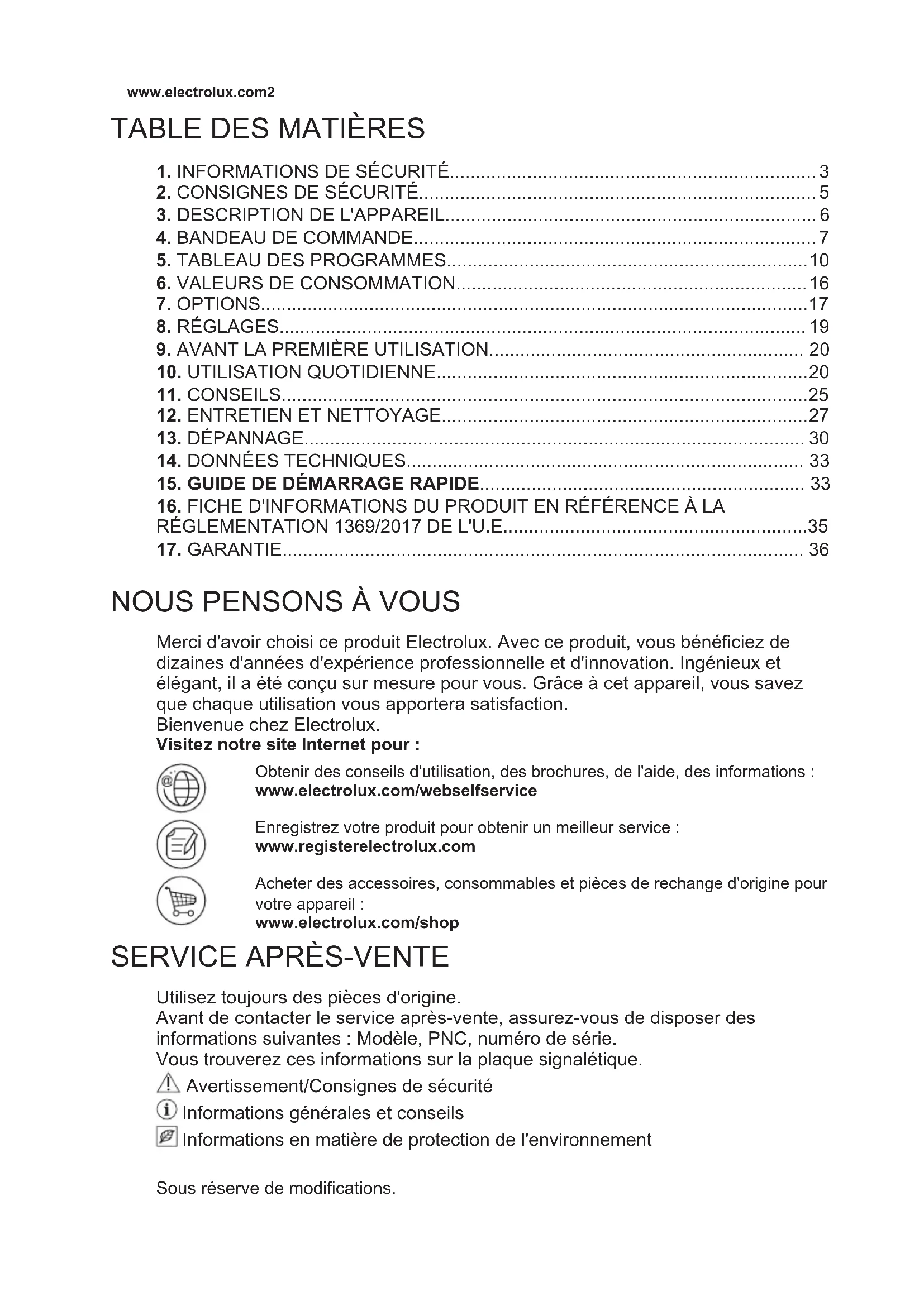 Merci d'avoir choisi ce produit Electrolux. Avec ce produit, vous bénéficiez de dizaines d'années d'expérience professionnelle et d'innovation. Ingénieux et élégant, il a été conçu sur mesure pour vous. Grâce à cet appareil, vous savez que chaque utilisation vous apportera satisfaction. Bienvenue chez Electrolux. Visitez notre site Internet pour : Obtenir des conseils d'utilisation, des brochures, de l'aide, des informations : www.electrolux.com/webselfservice Enregistrez votre produit pour obtenir un meilleur service : www.registerelectrolux.com Acheter des accessoires, consommables et pièces de rechange d'origine pour votre appareil : www.electrolux.com/shop