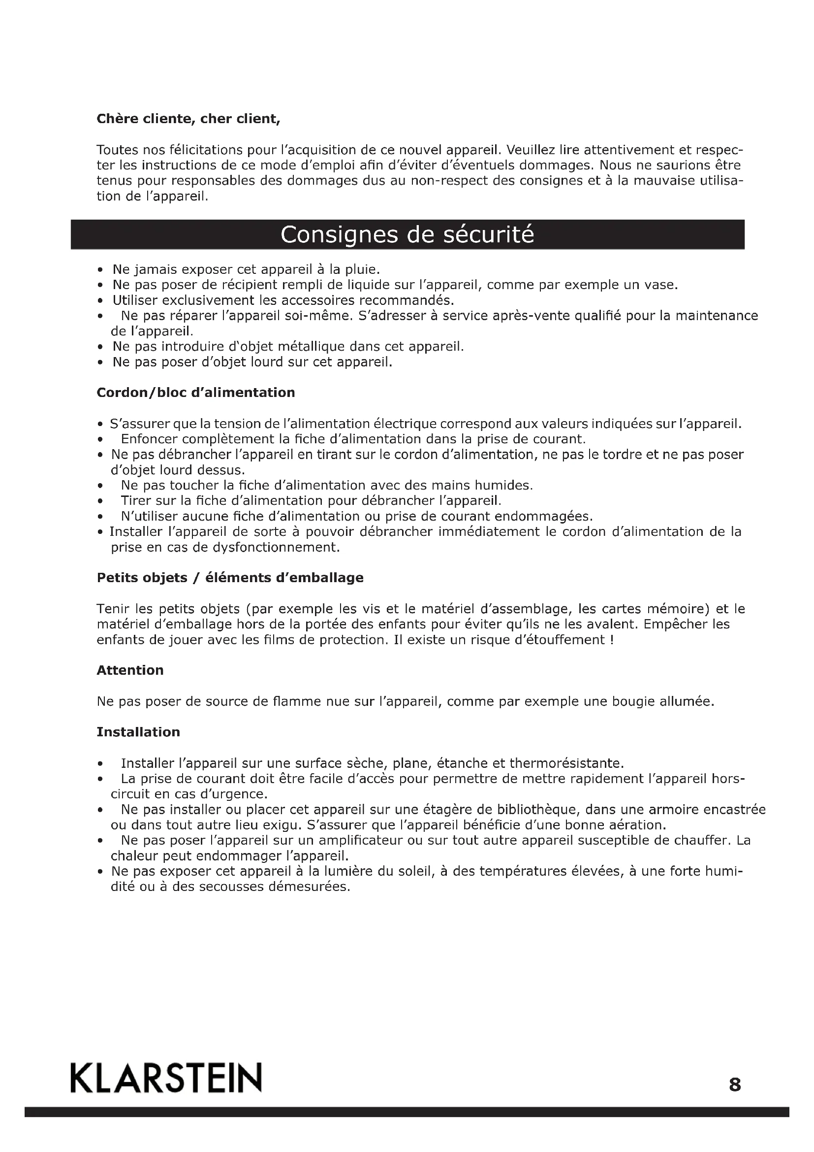 7Chère cliente, cher client, Toutes nos félicitations pour l’acquisition de ce nouvel appareil. Veuillez lire attentivement et respec- terlesinstructionsdecemoded’emploiand’éviterd’éventuelsdommages.Nousnesaurionsêtre tenus pour responsables des dommages dus au non-respect des consignes et à la mauvaise utilisa- tion de l’appareil. Consignes de sécurité