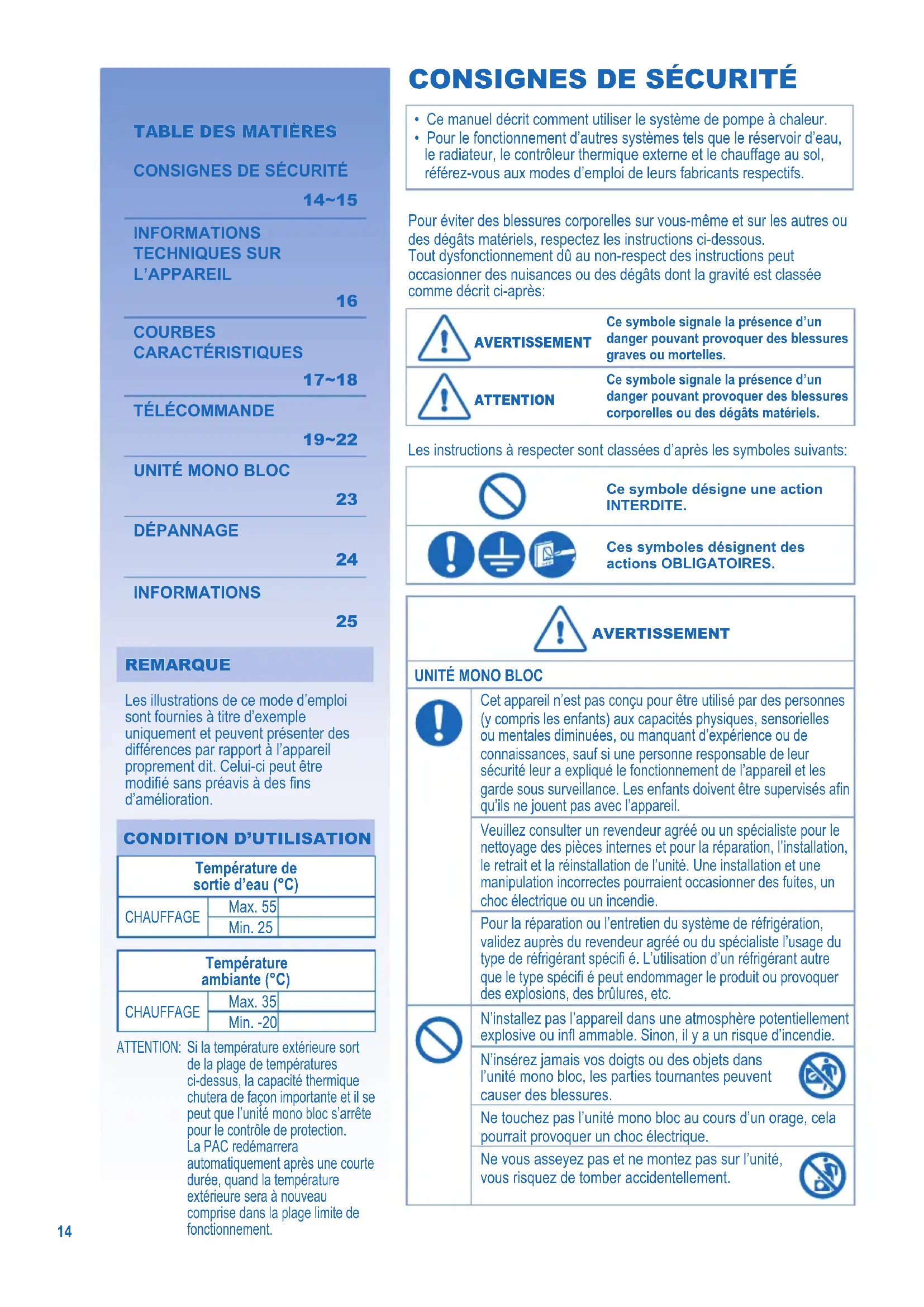 Température de sortie d’eau (°C) CHAUFFAGE Max. 55 Min. 25 Température ambiante (°C) CHAUFFAGE Max. 35 Min. -20 ATTENTION: Si la température extérieure sort de la plage de températures ci-dessus, la capacité thermique chutera de façon importante et il se peut que l’unité mono bloc s’arrête pour le contrôle de protection. La PAC redémarrera automatiquement après une courte durée, quand la température extérieure sera à nouveau comprise dans la plage limite de fonctionnement. Pour éviter des blessures corporelles sur vous-même et sur les autres ou des dégâts matériels, respectez les instructions ci-dessous. Tout dysfonctionnement dû au non-respect des instructions peut occasionner des nuisances ou des dégâts dont la gravité est classée comme décrit ci-après: AVERTISSEMENT AVERTISSEMENT Ce symbole signale la présence d’un danger pouvant provoquer des blessures graves ou mortelles. ATTENTION ATTENTION Ce symbole signale la présence d’un danger pouvant provoquer des blessures corporelles ou des dégâts matériels. Les instructions à respecter sont classées d’après les symboles suivants: Ce symbole désigne une action INTERDITE. Ces symboles désignent des actions OBLIGATOIRES. AVERTISSEMENT AVERTISSEMENT