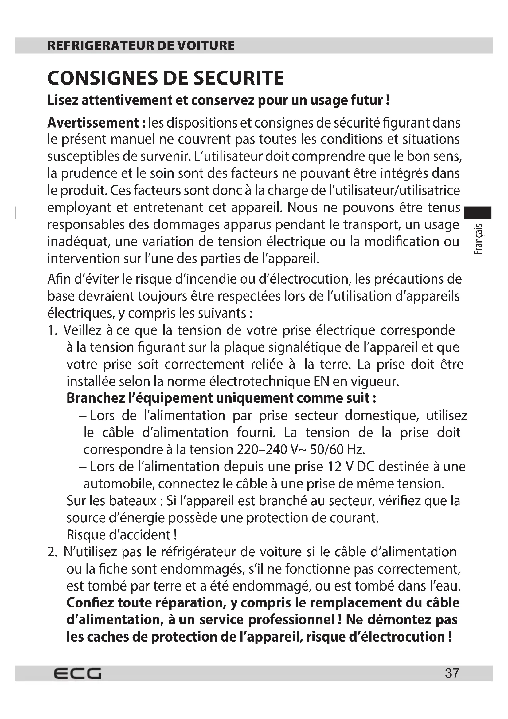 les instructions gurant dans le présent mode d’emploi. Ce réfrigérateur de voiture est destiné à un usage exclusivement domestique. Le fabricant ne peut être tenu responsable de dommages causés par un usage incorrect de cet appareil.