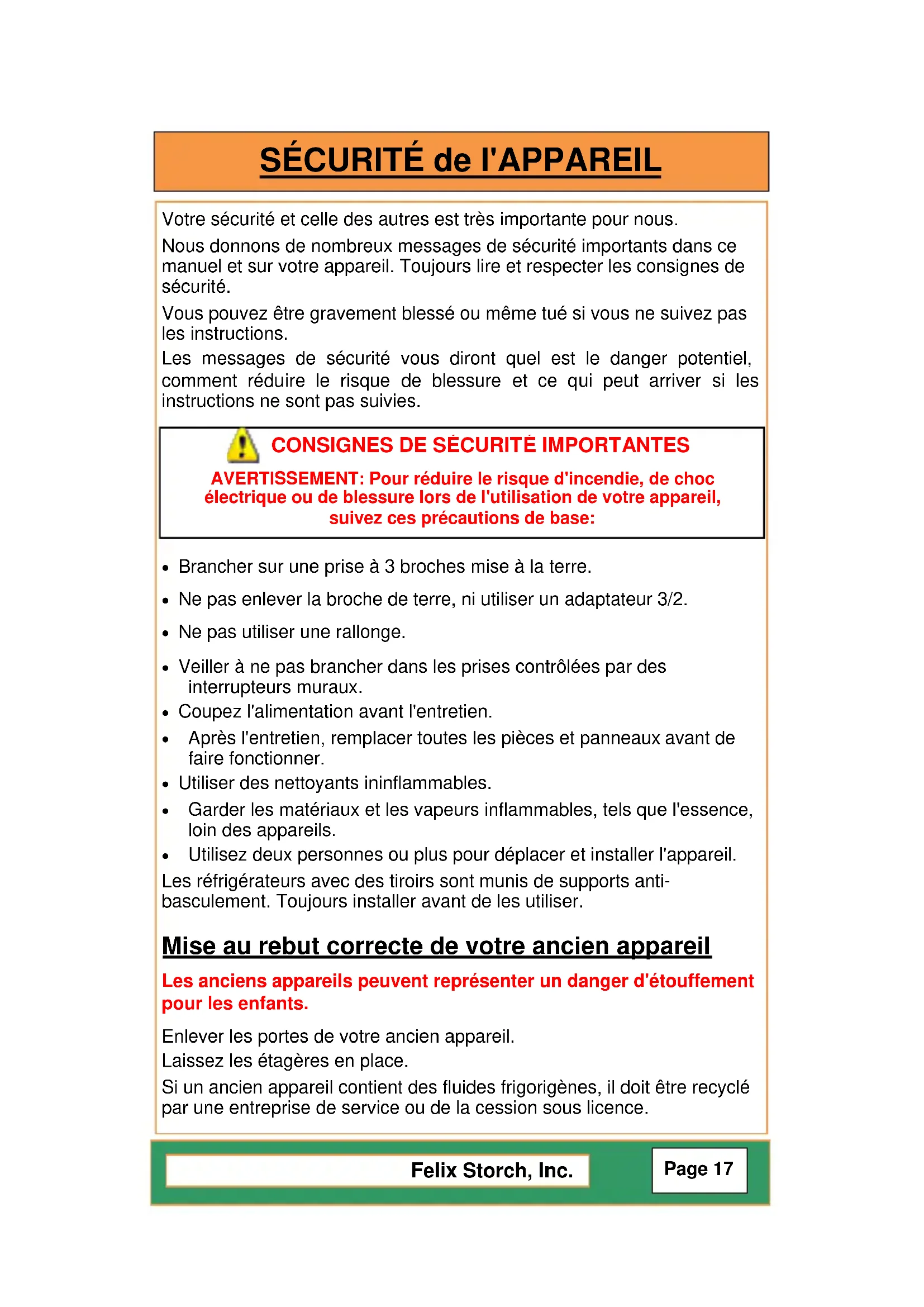électrique ou de blessure lors de l'utilisation de votre appareil, suivez ces précautions de base: Felix Storch, Inc. Page 17INSTRUCTIONS d’INSTALLATION Risque du poids excessif! Utilisez deux ou plus personnes pour déplacer et installer votre appareil. Défaut de le faire peut conduire aux blessures de dos ou d'autres. ATTENTION : Vous DEVEZ laisser l'appareil en position verticale pendant 24 heures avant de mettre-le en marche pour permettre au lubrifiant du compresseur à drainer. Panne de le faire peut nuire le fonctionnement et la longévité de l'unité.