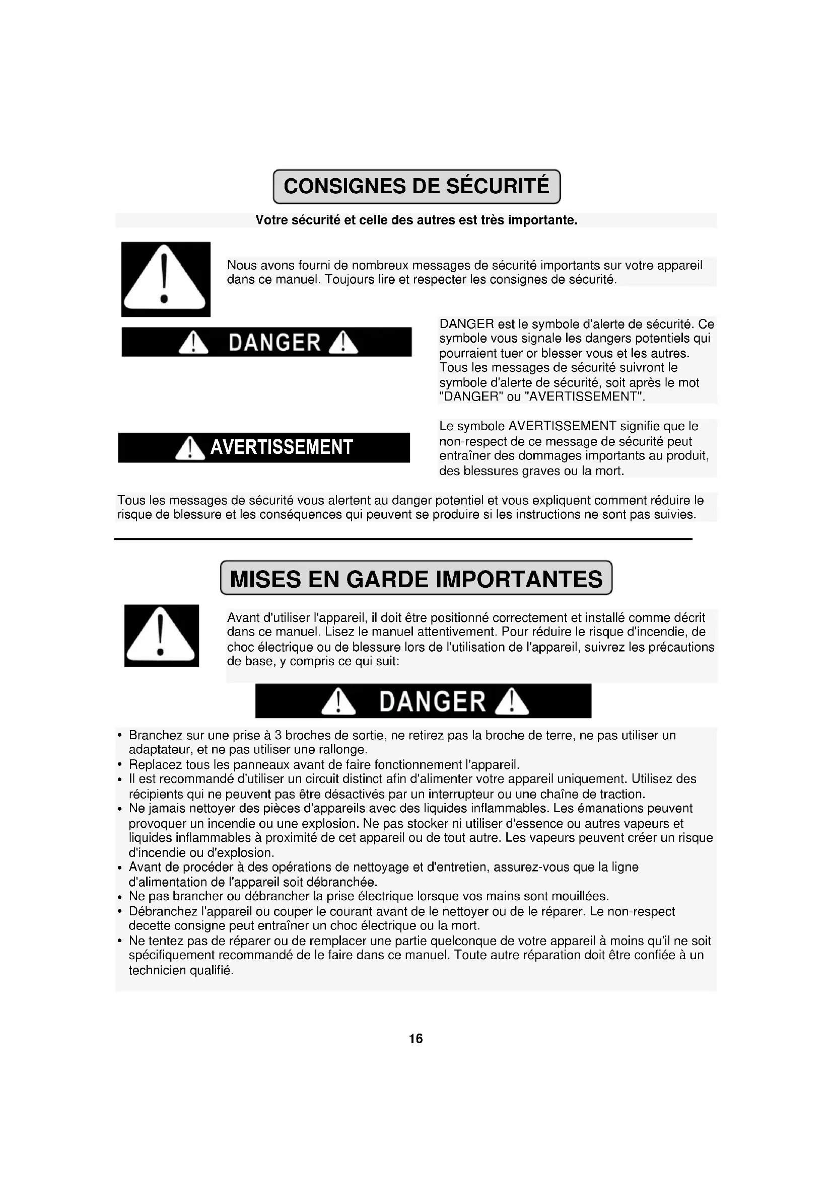 Ne jamais nettoyer des pièces d'appareils avec des liquides inflammables. Les émanations peuvent provoquer un incendie ou une explosion. Ne pas stocker ni utiliser d'essence ou autres vapeurs et liquides inflammables à proximité de cet appareil ou de tout autre. Les vapeurs peuvent créer un risque d'incendie ou d'explosion.