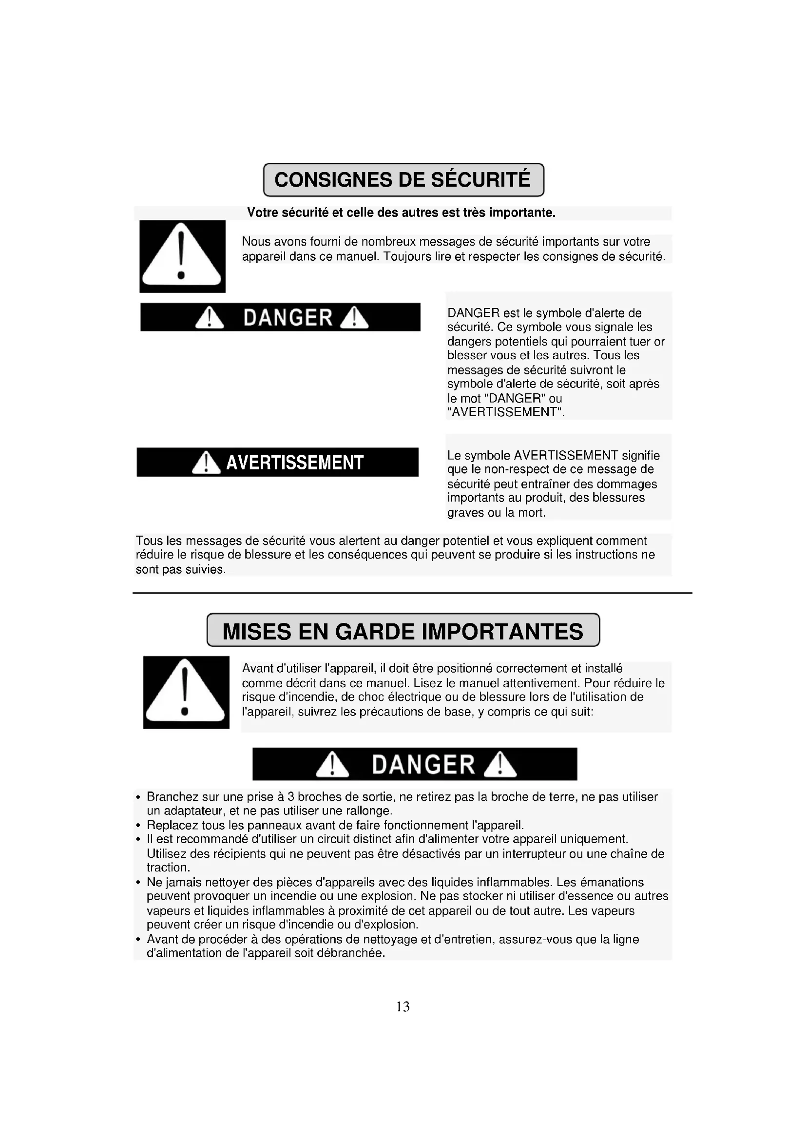 Suivez la légende des consignes d' AVERTISSEMENT ci-dessous lorsque applicables à votre modèle.