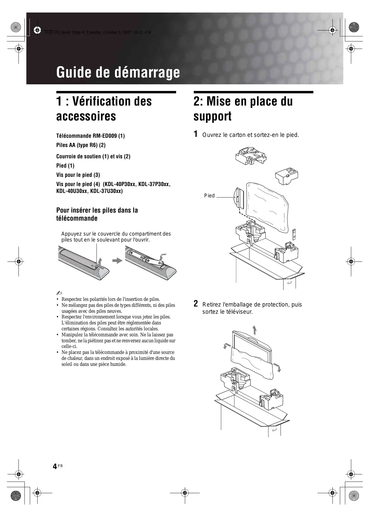 Guide de démarrage 4 Consignes de sécurité8 Précautions 9 Description des touches de la télécommande 10 Présentation des touches et témoins du téléviseur 11