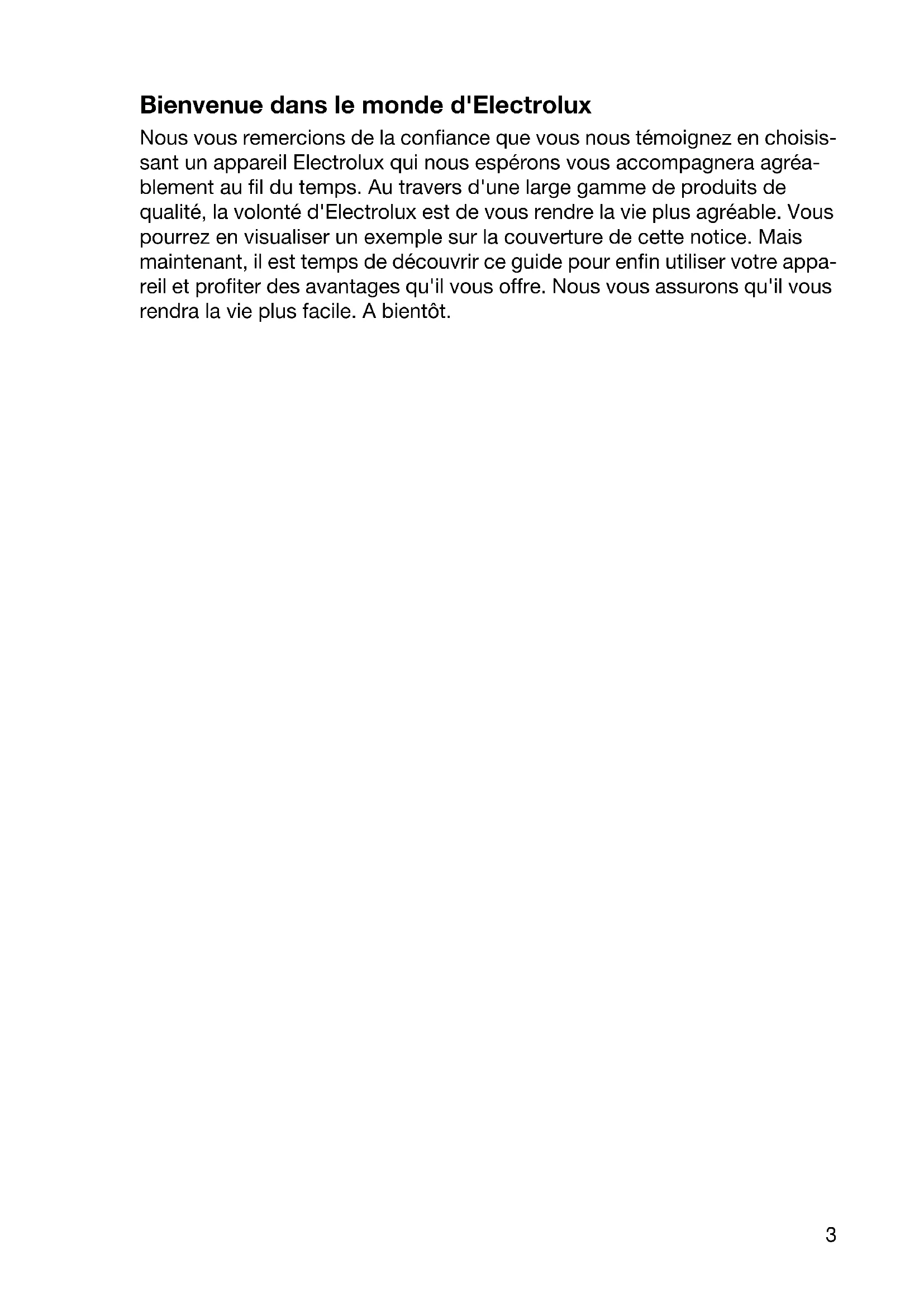 Nous vous remercions de la confiance que vous nous témoignez en choisissant un appareil Electrolux qui nous espérons vous accompagnera agréablement au fil du temps. Au travers d'une large gamme de produits de qualité, la volonté d'Electrolux est de vous rendre la vie plus agréable. Vous pourrez en visualiser un exemple sur la couverture de cette notice. Mais maintenant, il est temps de découvrir ce guide pour enfin utiliser votre appareil et profiter des avantages qu'il vous offre. Nous vous assurons qu'il vous rendra la vie plus facile. A bientôt.