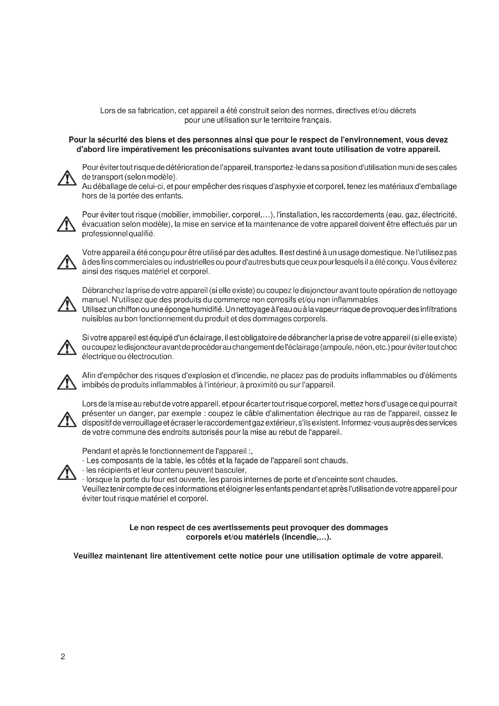 Débranchez l'appareil ou enlevez le fusible correspondant à la ligne de branchement de la cuisinière si celle-ci présente une quelconque anomalie. Protection de l’environnement Tous les matériaux marqués par le symbole sont recyclables. Déposez-les dans une déchetterie prévue à cet effet (renseignez-vous auprès des services de votre commune) pour qu’ils puissent être récupérés et recyclés. Le symbole sur le produit ou son emballage indique que ce produit ne peut être traité comme déchet ménager. Il doit être remis au point de collecte dédié à cet effet (collecte et recyclage du matériel électrique et électronique). En procédant à la mise à la casse réglementaire de l'appareil, nous préservons l'environnement et notre sécurité, s'assurant ainsi que le déchets seront traités dans des conditions appropriées. Pour obtenir plus de détails sur le recyclage de ce produit, veuillez prendre contact avec les services de votre commune ou le magasin où vous avez effectué l'achat. En cas d’anomalie de fonctionnement, reportez- vous à la rubrique "EN CAS D'ANOMALIE DE FONCTIONNEMENT". Si malgré toutes les vérifications, une intervention s'avère nécessaire, le vendeur de votre appareil est le premier habilité à intervenir. A défaut (déménagement de votre part, fermeture du magasin où vous avez effectué l’achat ...), veuillez consulter le Centre Contact Consommateurs qui vous communiquera alors l’adresse d’un Service Après Vente. En cas d’intervention sur l’appareil, exigez du service après vente les pièces de rechange certifiées Constructeur. Veuillez lire attentivement ces remarques avant d’installer et d’utiliser votre appareil. Nous déclinons toute responsabilité en cas de dommages ou d’accident provoqués par l’appareil du fait du non-respect de ces avertissements. Comment lire votre notice d'utilisation? Les symboles suivants vous guideront tout au long de la lecture de votre notice: Instructions de sécurité Descriptions d'opérations Conseils et recommandations Informations sur l'environnement Sommaire