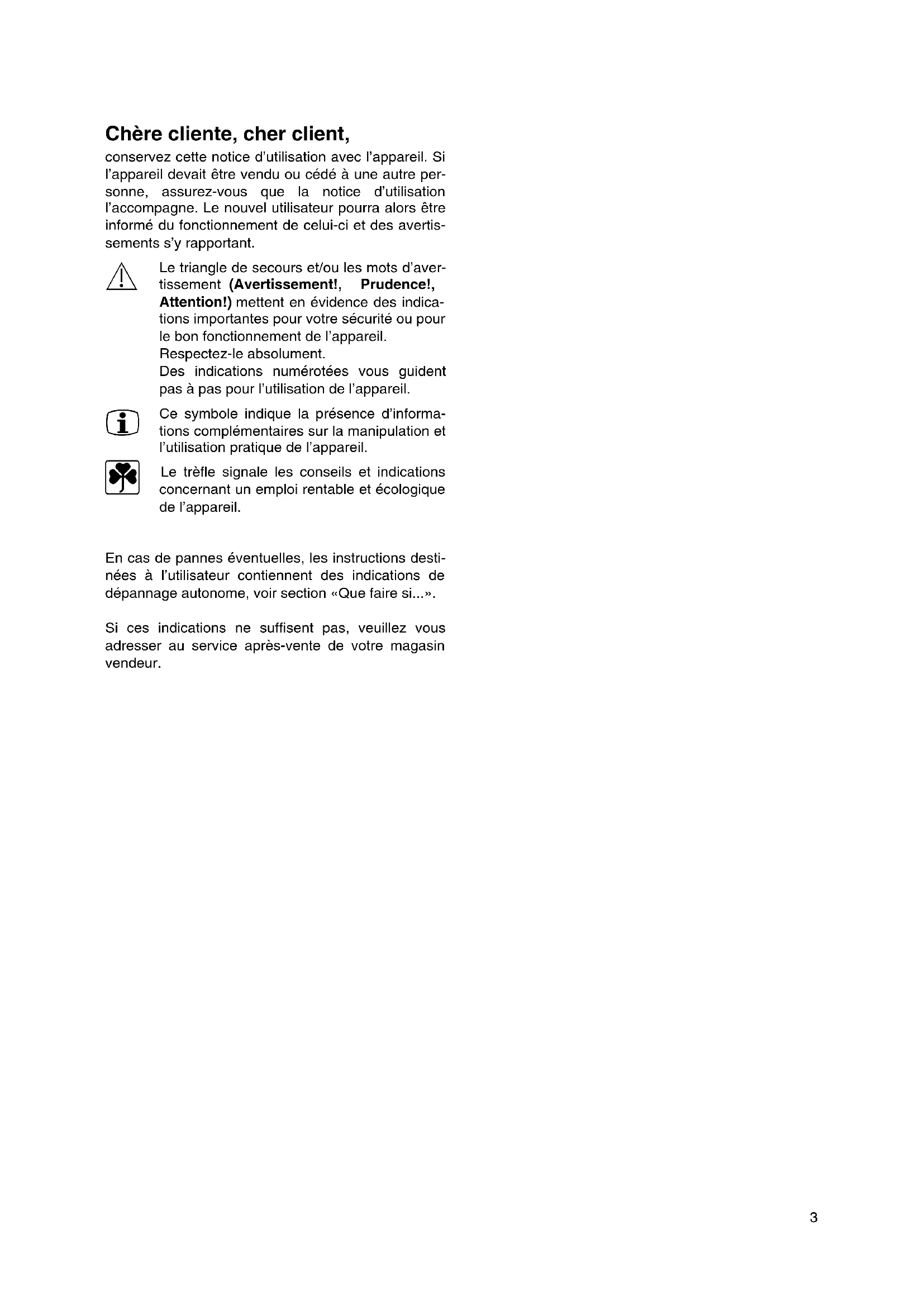 - Le trèfle signale les conseils et indications concernant un emploi rentable et écologique de l’appareil. En cas de pannes éventuelles, les instructions desti- nées à l’utilisateur contiennent des indications de dépannage autonome, voir section «Que faire si