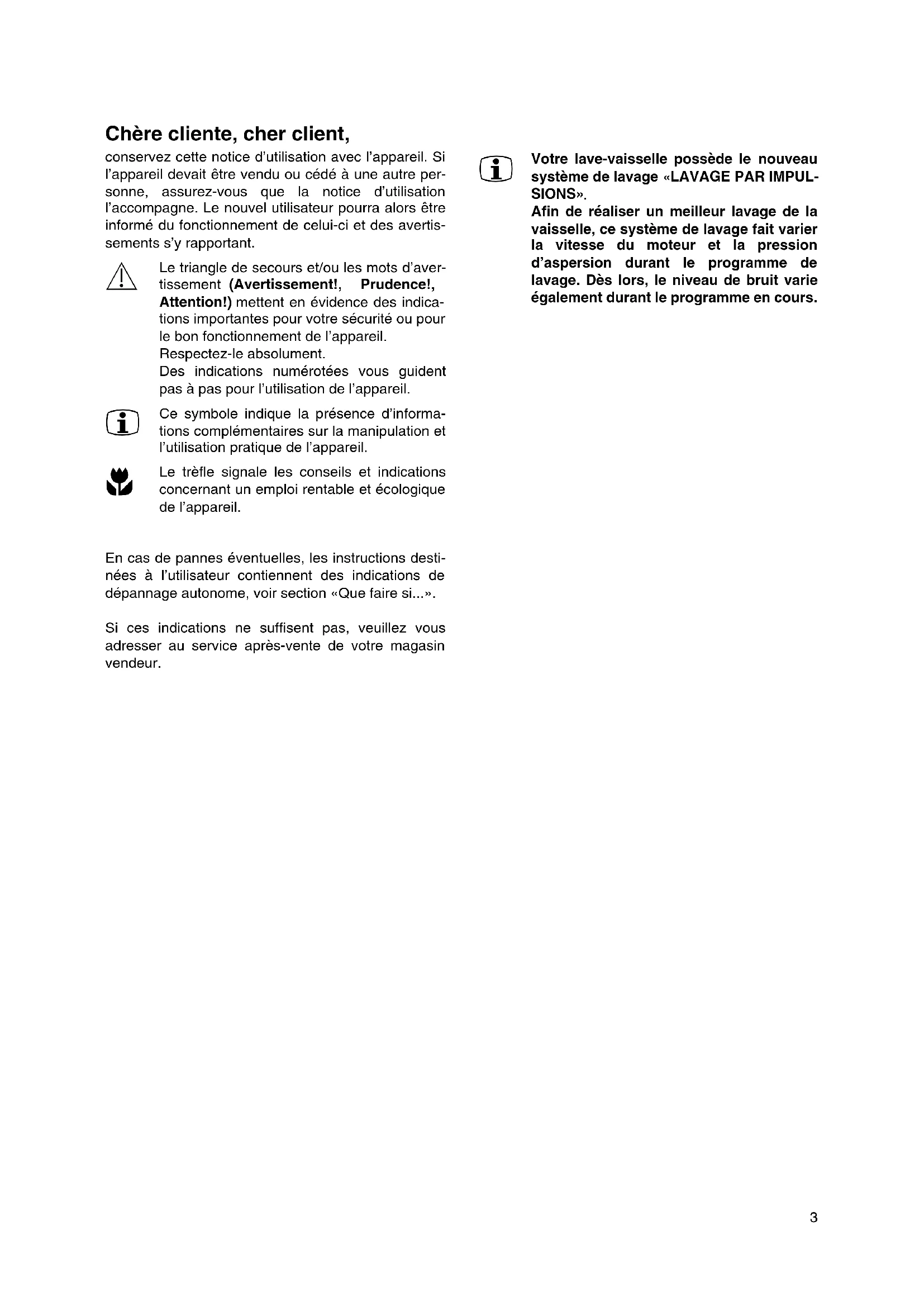 Le trèfle signale les conseils et indications concernant un emploi rentable et écologique de l’appareil. En cas de pannes éventuelles, les instructions desti- nées à l’utilisateur contiennent des indications de dépannage autonome, voir section «Que faire si...». Si ces indications ne suffisent pas, veuillez vous adresser au service après-vente de votre magasin vendeur.