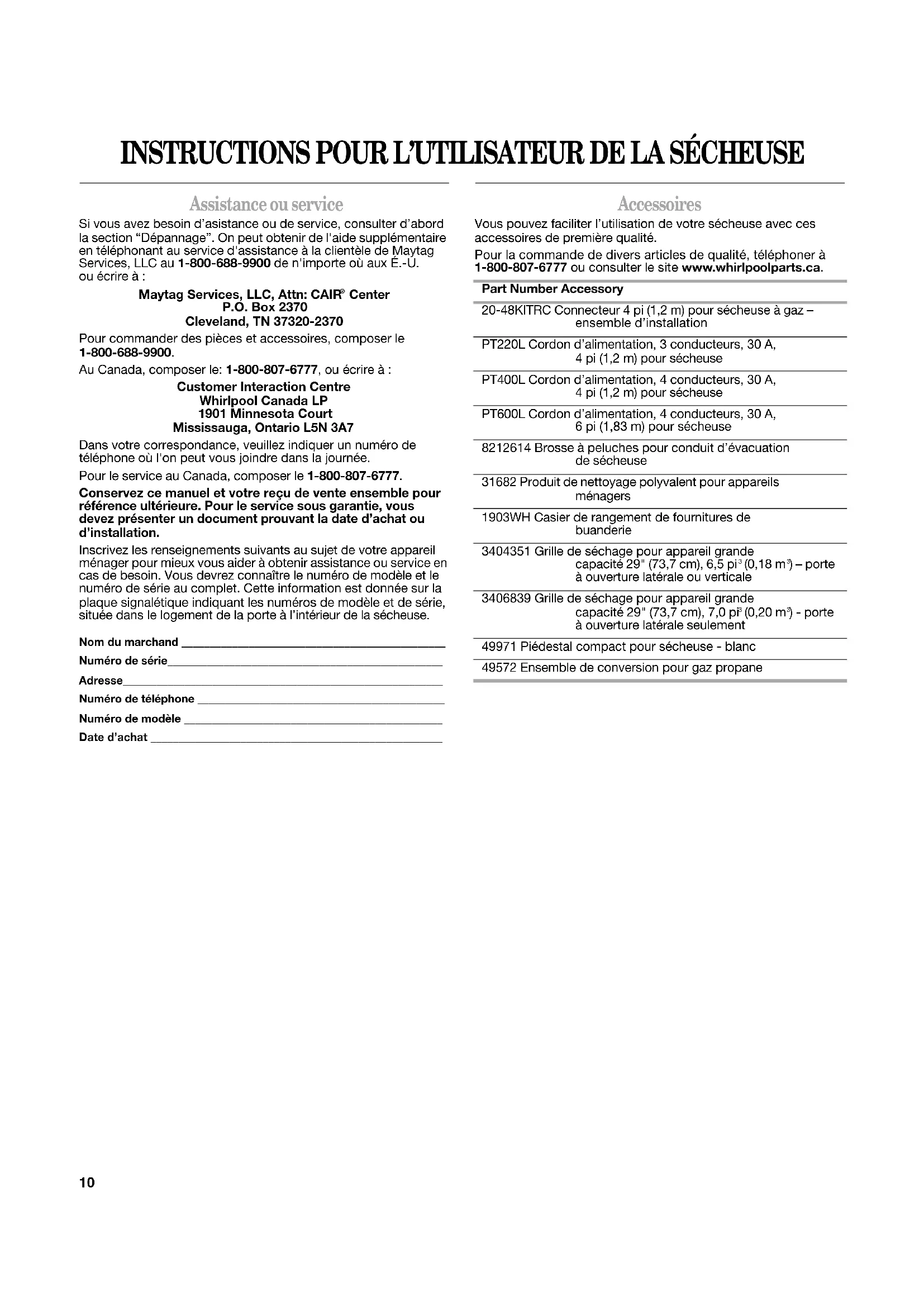 Center P.O. Box 2370 Cleveland, TN 37320-2370 Pour commander des pièces et accessoires, composer le 1-800-688-9900. Au Canada, composer le: 1-800-807-6777, ou écrire à : Customer Interaction Centre Whirlpool Canada LP 1901 Minnesota Court Mississauga, Ontario L5N 3A7 Dans votre correspondance, veuillez indiquer un numéro de téléphone où l'on peut vous joindre dans la journée. Pour le service au Canada, composer le 1-800-807-6777. Conservez ce manuel et votre reçu de vente ensemble pour référence ultérieure. Pour le service sous garantie, vous devez présenter un document prouvant la date d’achat ou d’installation. Inscrivez les renseignements suivants au sujet de votre appareil ménager pour mieux vous aider à obtenir assistance ou service en cas de besoin. Vous devrez connaître le numéro de modèle et le numéro de série au complet. Cette information est donnée sur la plaque signalétique indiquant les numéros de modèle et de série, située dans le logement de la porte à l’intérieur de la sécheuse. Nom du marchand _______________________________________________ Numéro de série_________________________________________________ Adresse_________________________________________________________ Numéro de téléphone ____________________________________________ Numéro de modèle ______________________________________________ Date d’achat ____________________________________________________ Accessoires Vous pouvez faciliter l’utilisation de votre sécheuse avec ces accessoires de première qualité. Pour la commande de divers articles de qualité, téléphoner à 1-800-807-6777 ou consulter le site www.whirlpoolparts.ca. Part Number Accessory 20-48KITRC Connecteur 4 pi (1,2 m) pour sécheuse à gaz – ensemble d’installation PT220L Cordon d’alimentation, 3 conducteurs, 30 A, 4 pi (1,2 m) pour sécheuse PT400L Cordon d’alimentation, 4 conducteurs, 30 A, 4 pi (1,2 m) pour sécheuse PT600L Cordon d’alimentation, 4 conducteurs, 30 A, 6 pi (1,83 m) pour sécheuse 8212614 Brosse à peluches pour conduit d’évacuation de sécheuse 31682 Produit de nettoyage polyvalent pour appareils ménagers 1903WH Casier de rangement de fournitures de buanderie 3404351 Grille de séchage pour appareil grande capacité 29" (73,7 cm), 6,5 pi