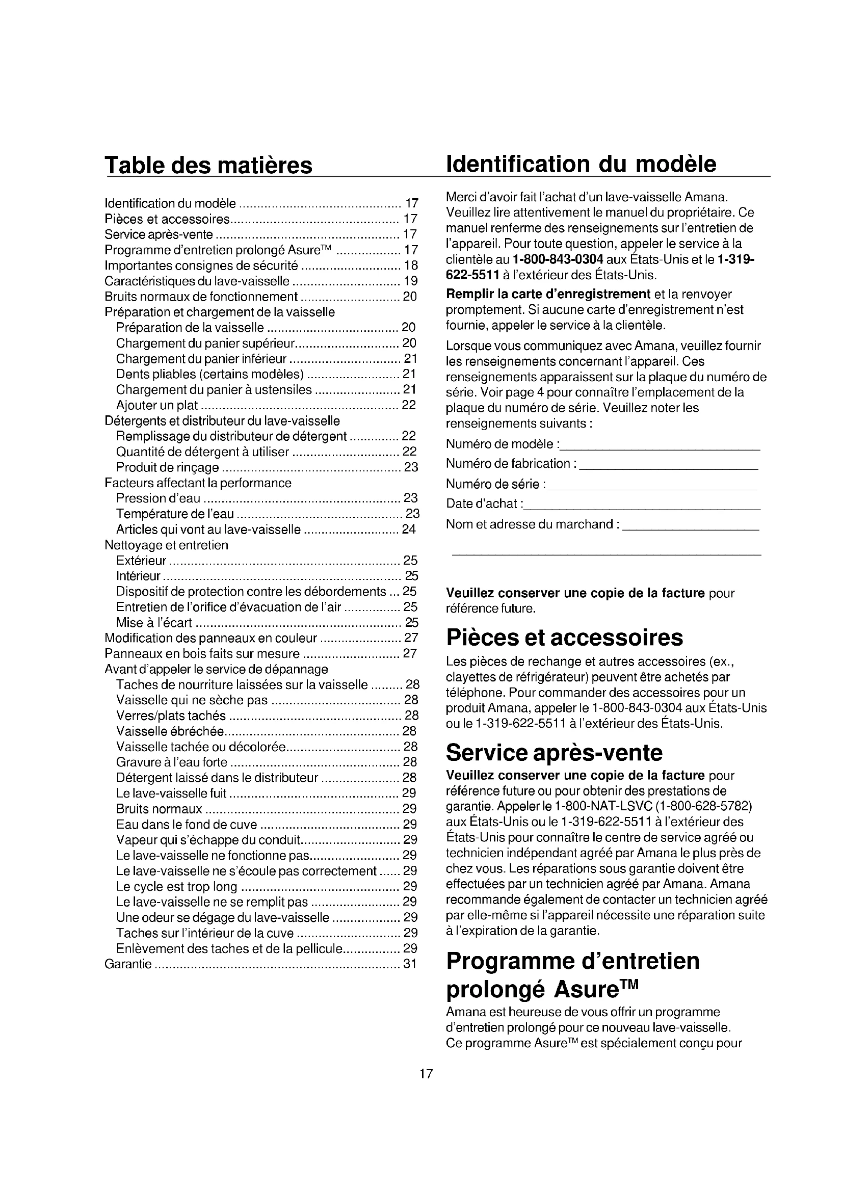 *This warranty gives you specific legal rights and you may have others which vary from state to state. For example, some states do not allow the exclusion or limitation of incidental or consequential damages so this exclusion may not apply to you. For answers to questions regarding the above or to locate an authorized servicer, contact: Amana Appliances 2800 220th Trail PO Box 8901 Amana, Iowa 52204-0001 1-800-843-0304 if inside U.S.A. 1-319-622-5511 if outside U.S.A. Warranty1617 Identification du modèle Merci d’avoir fait l’achat d’un lave-vaisselle Amana. Veuillez lire attentivement le manuel du propriétaire. Ce manuel renferme des renseignements sur l’entretien de l’appareil. Pour toute question, appeler le service à la clientèle au 1-800-843-0304 aux États-Unis et le 1-319- 622-5511 à l’extérieur des États-Unis. Remplir la carte d’enregistrement et la renvoyer promptement. Si aucune carte d’enregistrement n’est fournie, appeler le service à la clientèle. Lorsque vous communiquez avec Amana, veuillez fournir les renseignements concernant l’appareil. Ces renseignements apparaissent sur la plaque du numéro de série. Voir page 4 pour connaître l’emplacement de la plaque du numéro de série. Veuillez noter les renseignements suivants : Numéro de modèle :____________________________ Numéro de fabrication : _________________________ Numéro de série : _____________________________ Date d'achat :_________________________________ Nom et adresse du marchand : ___________________