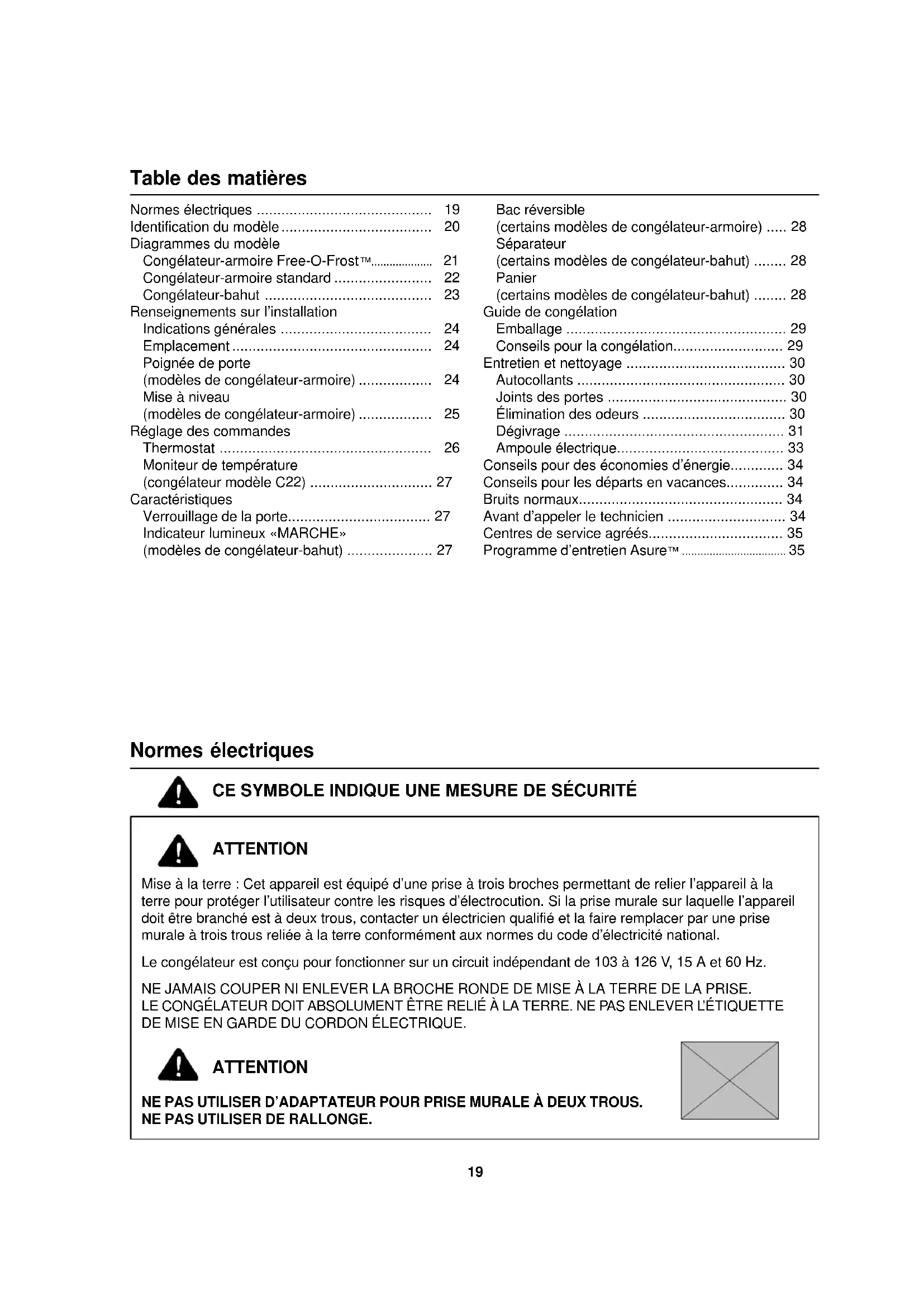 - Programme d’entretien Asure ™ Normes électriques CE SYMBOLE INDIQUE UNE MESURE DE SÉCURITÉ ATTENTION Mise à la terre : Cet appareil est équipé d’une prise à trois broches permettant de relier l’appareil à la terre pour protéger l’utilisateur contre les risques d’électrocution. Si la prise murale sur laquelle l’appareil doit être branché est à deux trous, contacter un électricien qualifié et la faire remplacer par une prise murale à trois trous reliée à la terre conformément aux normes du code d’électricité national. Le congélateur est conçu pour fonctionner sur un circuit indépendant de 103 à 126 V, 15 A et 60 Hz. NE JAMAIS COUPER NI ENLEVER LA BROCHE RONDE DE MISE À LA TERRE DE LA PRISE. LE CONGÉLATEUR DOIT ABSOLUMENT ÊTRE RELIÉ À LA TERRE. NE PAS ENLEVER L’ÉTIQUETTE DE MISE EN GARDE DU CORDON ÉLECTRIQUE. ATTENTION NE PAS UTILISER D’ADAPTATEUR POUR PRISE MURALE À DEUX TROUS. p. 35