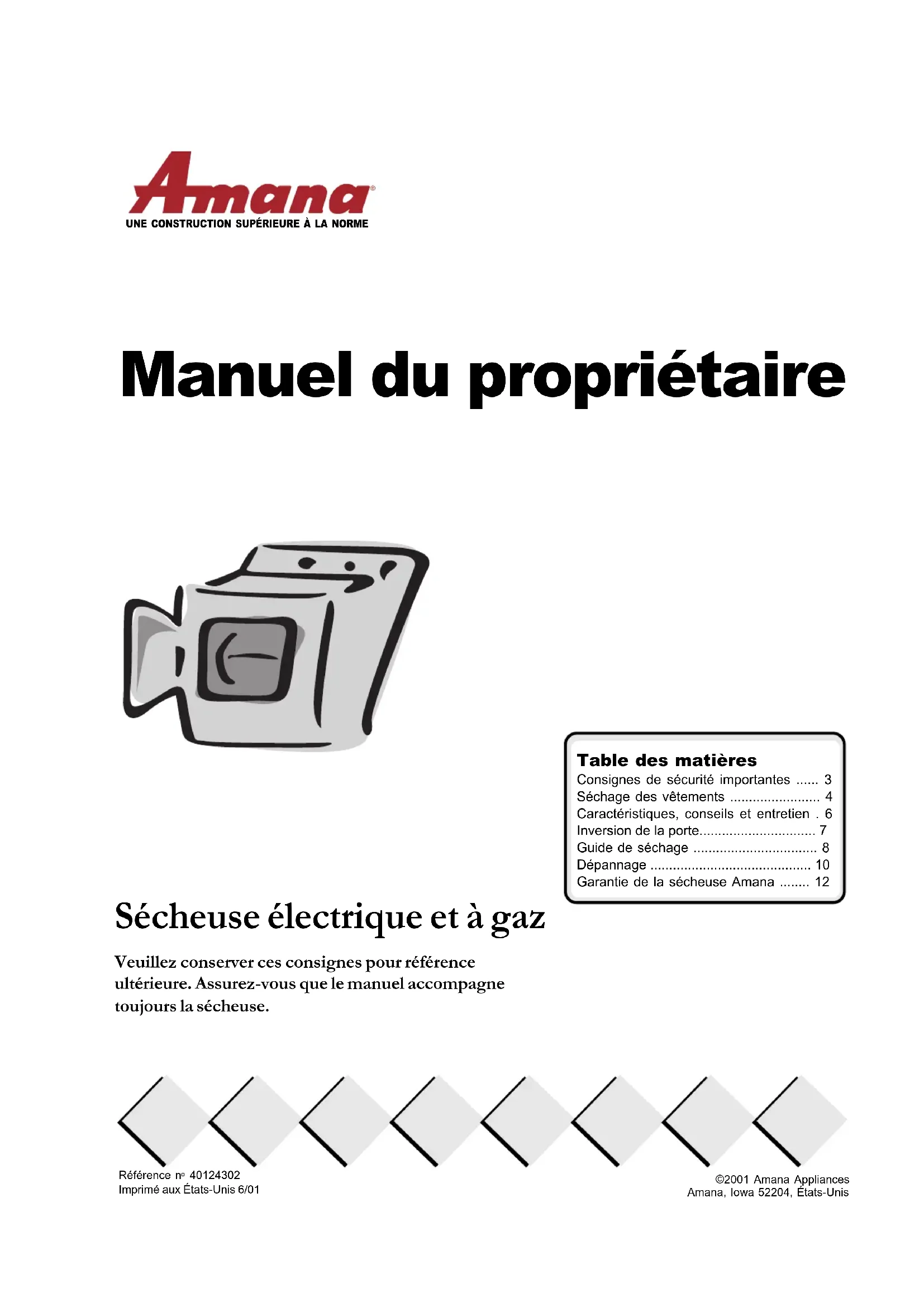 - Garantie de la sécheuse Amana UNE CONSTRUCTION SUPÉRIEURE À LA NORME©2001 Amana AppliancesAmana, Iowa 52204, États-UnisRéférence n 40124302Imprimé aux États-Unis 6/012 Apprenez à reconnaître ces symboles, mots et étiquettes relatifs à la sécurité DANGER p. 12