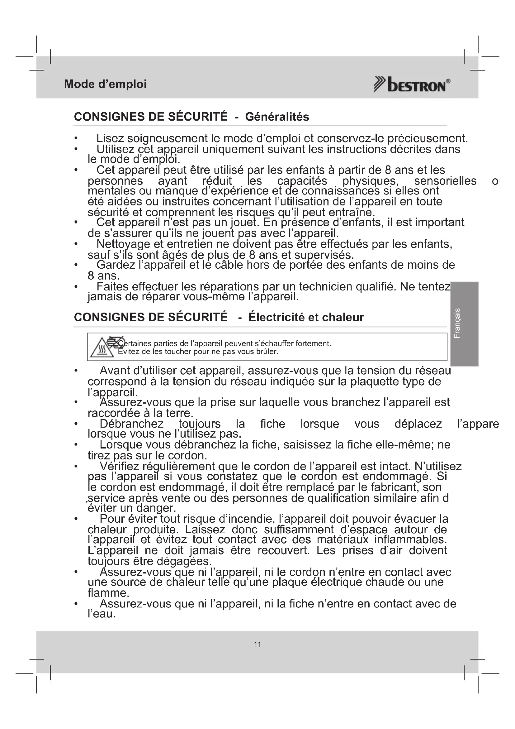 - Faiteseffectuerlesréparationsparuntechnicienqualifié.Netentez jamaisderéparervous-mêmel’appareil. CONSIGNES DE SÉCURITÉ - Électricité et chaleur