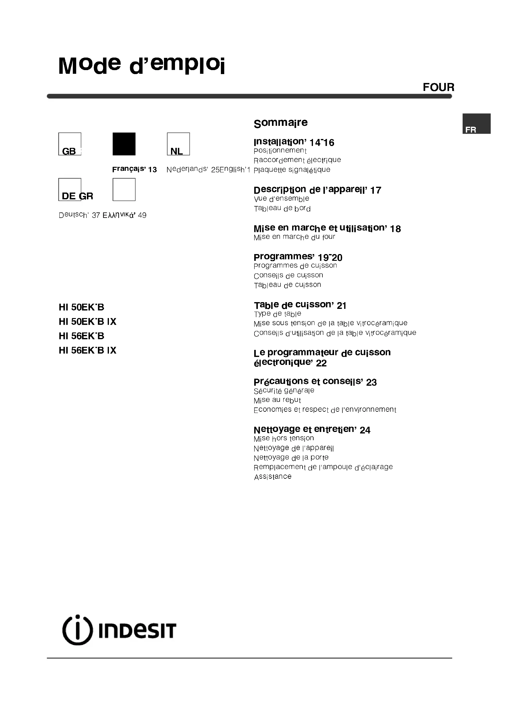 MODE D'EMPLOI HI 50 EK.B IX INDESIT