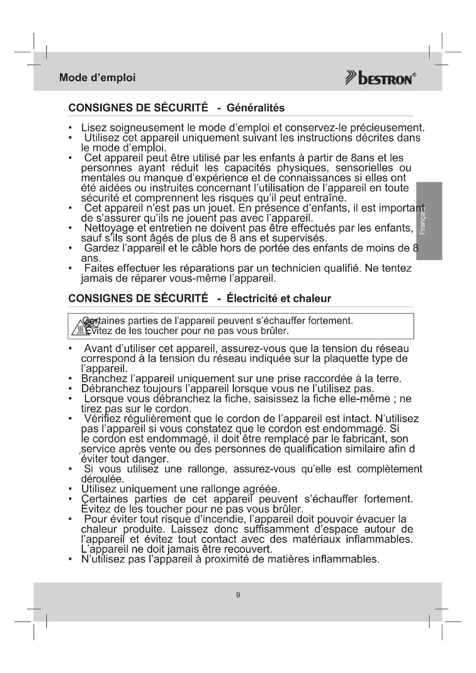 Français CONSIGNES DE SÉCURITÉ - Généralités