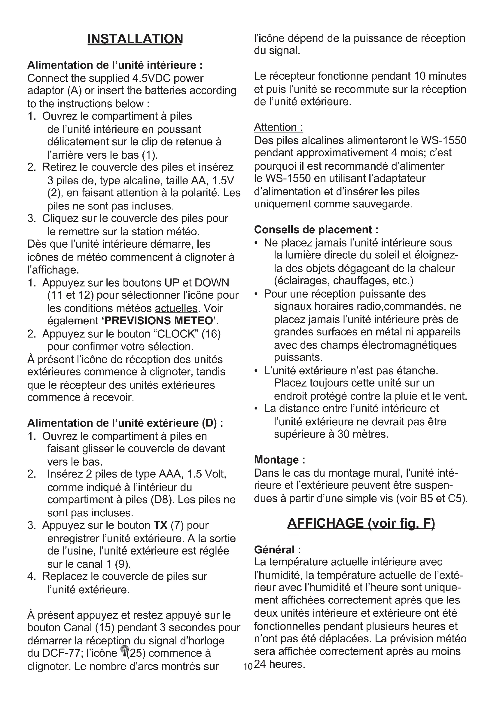 l’unité extérieure. À présent appuyez et restez appuyé sur le bouton Canal (15) pendant 3 secondes pour démarrer la réception du signal d’horloge du DCF-77; l’icône (25) commence à clignoter. Le nombre d’arcs montrés sur l’icône dépend de la puissance de réception du signal. Le récepteur fonctionne pendant 10 minutes et puis l’unité se recommute sur la réception de l’unité extérieure. Attention : Des piles alcalines alimenteront le WS-1550 pendant approximativement 4 mois; c’est pourquoi il est recommandé d’alimenter le WS-1550 en utilisant l’adaptateur d’alimentation et d’insérer les piles uniquement comme sauvegarde. Conseils de placement :