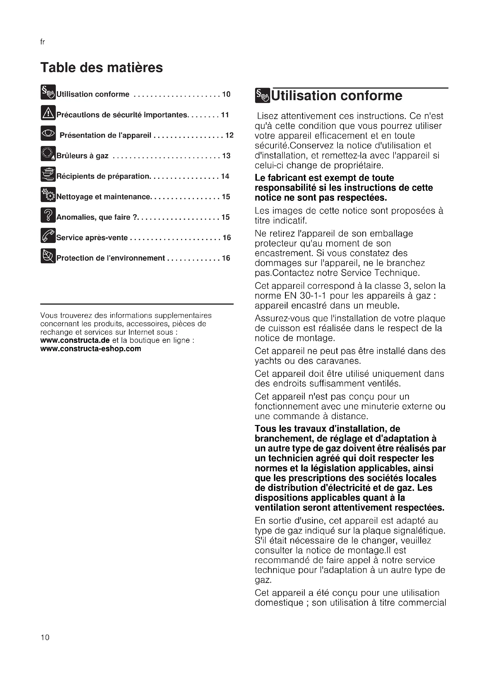 - Présentation de l'appareil . . . . . . . . . . . . . . . . . 12 Ä Brûleurs à gaz . . . . . . . . . . . . . . . . . . . . . . . . . . 13 Å Récipients de préparation. . . . . . . . . . . . . . . . . 14 2 Nettoyage et maintenance. . . . . . . . . . . . . . . . . 15 3 Anomalies, que faire ?. . . . . . . . . . . . . . . . . . . . 15 4 Service après-vente . . . . . . . . . . . . . . . . . . . . . . 16 7 Protection de l'environnement . . . . . . . . . . . . . 16 Produktinfo Vous trouverez des informations supplementaires concernant les produits, accessoires, pièces de rechange et services sur Internet sous : www.constructa.de et la boutique en ligne : www.constructa-eshop.com 8Utilisation conforme Utilisation conf or me Lisez attentivement ces instructions. Ce n'est qu'à cette condition que vous pourrez utiliser votre appareil efficacement et en toute sécurité.Conservez la notice d'utilisation et d'installation, et remettez-la avec l'appareil si celui-ci change de propriétaire. Le fabricant est exempt de toute responsabilité si les instructions de cette notice ne sont pas respectées. Les images de cette notice sont proposées à titre indicatif. Ne retirez l'appareil de son emballage protecteur qu'au moment de son encastrement. Si vous constatez des dommages sur l'appareil, ne le branchez pas.Contactez notre Service Technique. Cet appareil correspond à la classe 3, selon la norme EN 30-1-1 pour les appareils à gaz : appareil encastré dans un meuble. Assurez-vous que l'installation de votre plaque de cuisson est réalisée dans le respect de la notice de montage. Cet appareil ne peut pas être installé dans des yachts ou des caravanes. Cet appareil doit être utilisé uniquement dans des endroits suffisamment ventilés. Cet appareil n'est pas conçu pour un fonctionnement avec une minuterie externe ou une commande à distance. Tous les travaux d'installation, de branchement, de réglage et d'adaptation à un autre type de gaz doivent être réalisés par un technicien agréé qui doit respecter les normes et la législation applicables, ainsi que les prescriptions des sociétés locales de distribution d'électricité et de gaz. Les dispositions applicables quant à la ventilation seront attentivement respectées. En sortie d'usine, cet appareil est adapté au type de gaz indiqué sur la plaque signalétique. S'il était nécessaire de le changer, veuillez consulter la notice de montage.Il est recommandé de faire appel à notre service technique pour l'adaptation à un autre type de gaz. Cet appareil a été conçu pour une utilisation domestique ; son utilisation à titre commercialPrécautions de sécurité importantes fr