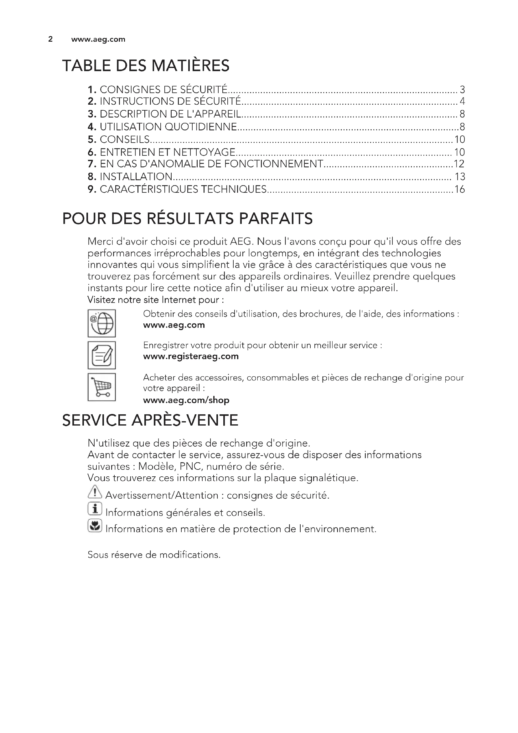 Merci d'avoir choisi ce produit AEG. Nous l'avons conçu pour qu'il vous offre des performances irréprochables pour longtemps, en intégrant des technologies innovantes qui vous simplifient la vie grâce à des caractéristiques que vous ne trouverez pas forcément sur des appareils ordinaires. Veuillez prendre quelques instants pour lire cette notice afin d'utiliser au mieux votre appareil. Visitez notre site Internet pour : Obtenir des conseils d'utilisation, des brochures, de l'aide, des informations : www.aeg.com Enregistrer votre produit pour obtenir un meilleur service : www.registeraeg.com Acheter des accessoires, consommables et pièces de rechange d'origine pour votre appareil : www.aeg.com/shop