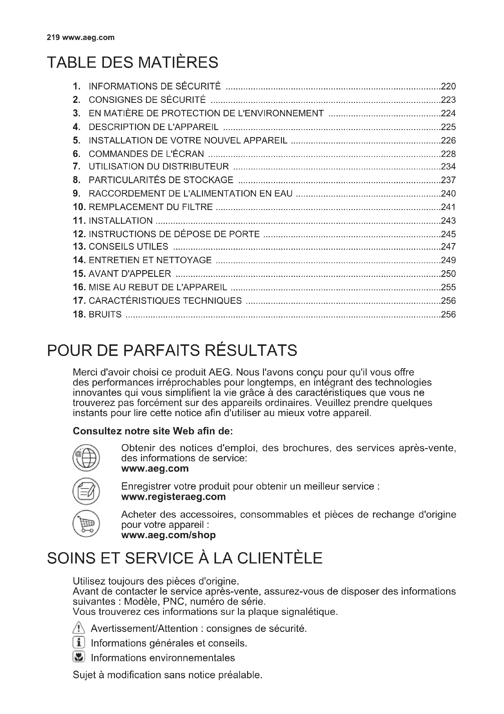 Merci d'avoir choisi ce produit AEG. Nous l'avons conçu pour qu'il vous ore des performances irréprochables pour longtemps, en intégrant des technologies innovantes qui vous simplient la vie grâce à des caractéristiques que vous ne trouverez pas forcément sur des appareils ordinaires. Veuillez prendre quelques instants pour lire cette notice an d'utiliser au mieux votre appareil. Consultez notre site Web an de: Obtenir des notices d'emploi, des brochures, des services après-vente, des informations de service: www.aeg.com Enregistrer votre produit pour obtenir un meilleur service : www.registeraeg.com Acheter des accessoires, consommables et pièces de rechange d'origine pour votre appareil : www.aeg.com/shop Sujet à modication sans notice préalable.
