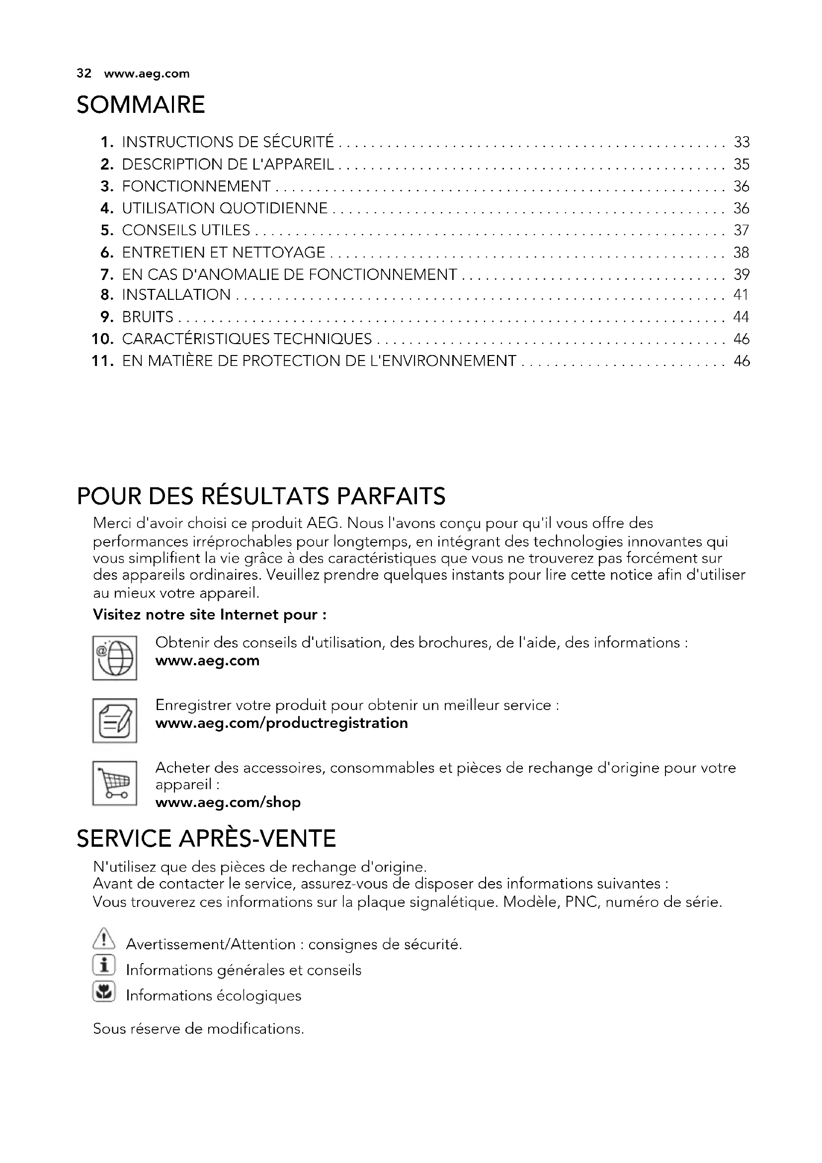 N'utilisez que des pièces de rechange d'origine. Avant de contacter le service, assurez-vous de disposer des informations suivantes : Vous trouverez ces informations sur la plaque signalétique. Modèle, PNC, numéro de série. Avertissement/Attention : consignes de sécurité. Informations générales et conseils Informations écologiques Sous réserve de modifications.