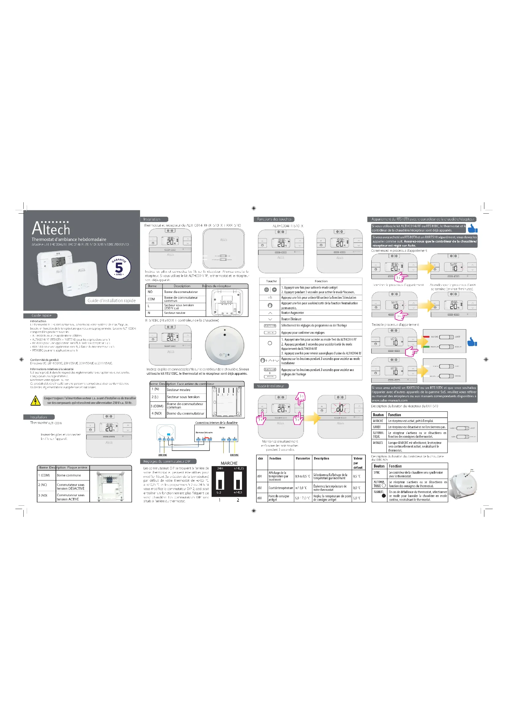 Guide d’installation rapide Thermostat d'ambiance hebdomadaire Modèle : ALTHC004i/ALTHC014i RF/RT510TX/RT510BC/RXRT510 Coupez toujours l’alimentation secteur c.a. avant d’installer ou de travailler sur des composants qui nécessitent une alimentation 230V c.a. 50Hz.IntroductionLe thermostat ALTHC004i activera ou désactivera votre système de chauffage, au besoin, en fonction de la température que vous avez programmée. La série ALTHC004i comprend les produits suivants :• ALTHC004i pour les applications câblées• ALTHC014i RF (RT510TX + RXRT510) pour les applications sans fil• RT510TX pour une application sans fil, à l’aide du récepteur 5 x 5 • RXRT510 pour une application sans fil, à l’aide du transmetteur 5 x 5• RT510BC pour une application sans filConformité du produitDirectives UE : 2014/30/UE, 2014/35/UE, 2014/53/UE et 2011/65/UE. Informations relatives à la sécuritéUtilisez le produit dans le respect des réglementations européennes et nationales.Conçu pour un usage intérieur.Maintenez votre appareil au sec.Ce produit doit être installé par une personne compétente et en conformité avec toutes les réglementations européennes et nationales. Installation Installation Fonctions des touches Appariement du RT510TX avec le contrôleur de la chaudière/récepteur Mode Installateur Réglages du commutateur DIP Guide rapide Thermostat ALTHC004i Borne Description Plaque arrièreBorne commune1(COM)2(NC)Commutateur sous tension DÉSACTIVÉ3(NO)Commutateur sous tension ACTIVÉRÉINITIALISERSÉLECTIONNER