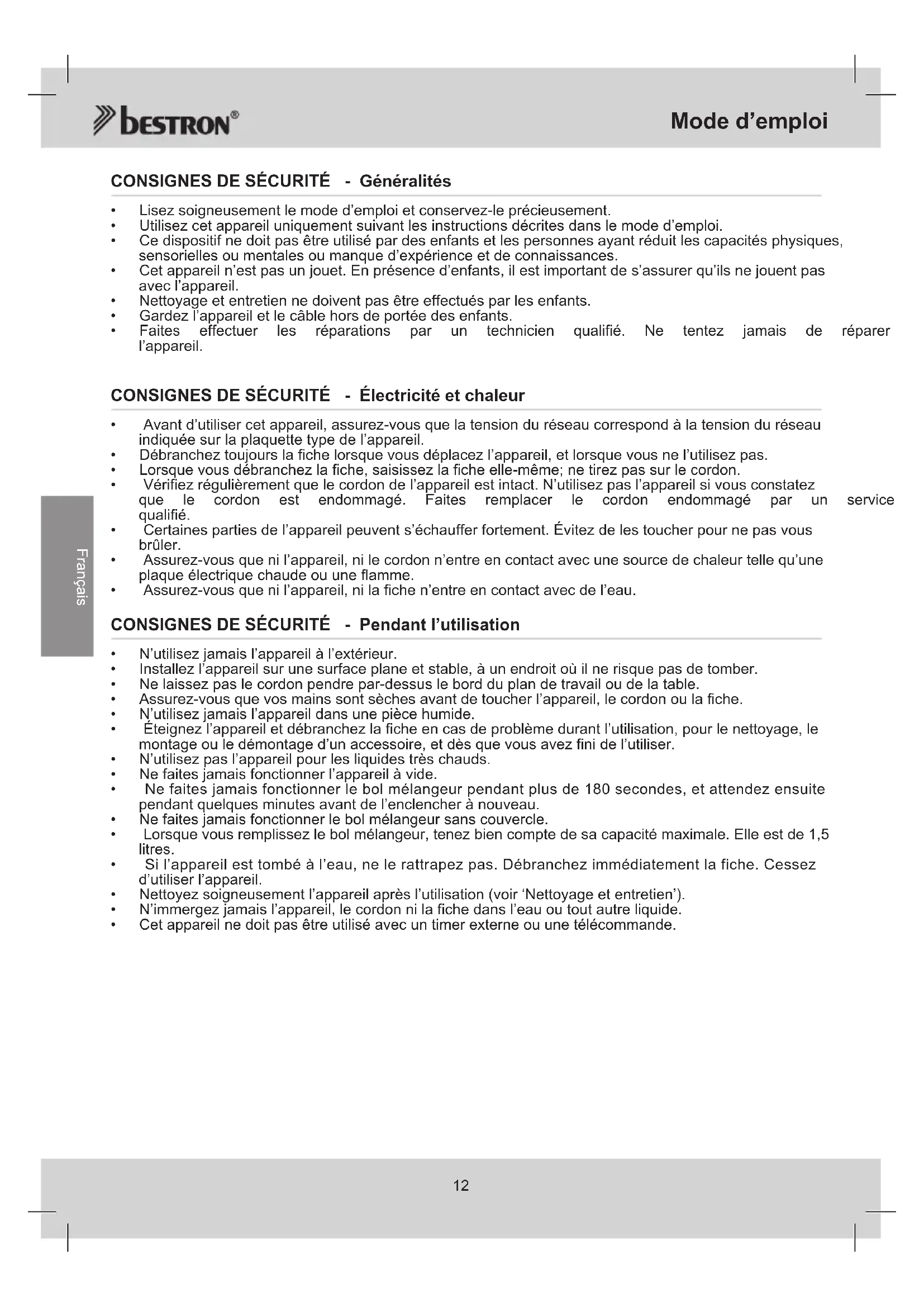 Français CONSIGNES DE SÉCURITÉ - Généralités