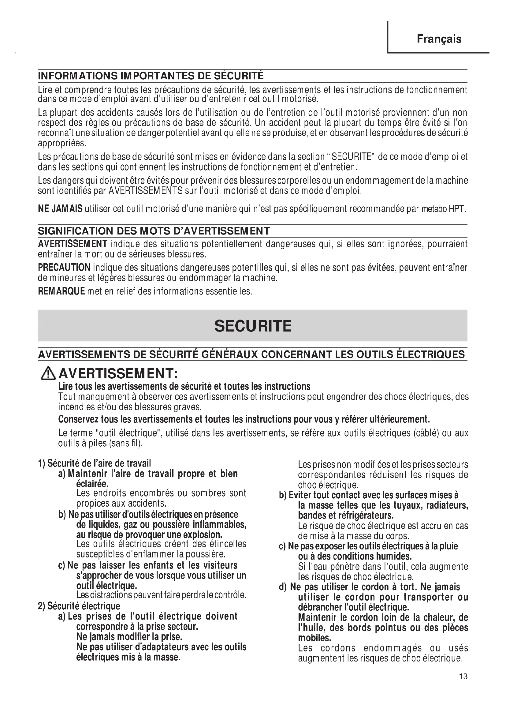 Lire et comprendre toutes les précautions de sécurité, les avertissements et les instructions de fonctionnement dans ce mode d’emploi avant d’utiliser ou d’entretenir cet outil motorisé. La plupart des accidents causés lors de l’utilisation ou de l’entretien de l’outil motorisé proviennent d’un non respect des règles ou précautions de base de sécurité. Un accident peut la plupart du temps être évité si l’on reconnaît une situation de danger potentiel avant qu’elle ne se produise, et en observant les procédures de sécurité appropriées. Les précautions de base de sécurité sont mises en évidence dans la section “SECURITE” de ce mode d’emploi et dans les sections qui contiennent les instructions de fonctionnement et d’entretien. Les dangers qui doivent être évités pour prévenir des blessures corporelles ou un endommagement de la machine sont identifiés par AVERTISSEMENTS sur l’outil motorisé et dans ce mode d’emploi. NE JAMAIS utiliser cet outil motorisé d’une manière qui n’est pas spécifiquement recommandée par metabo HPT.