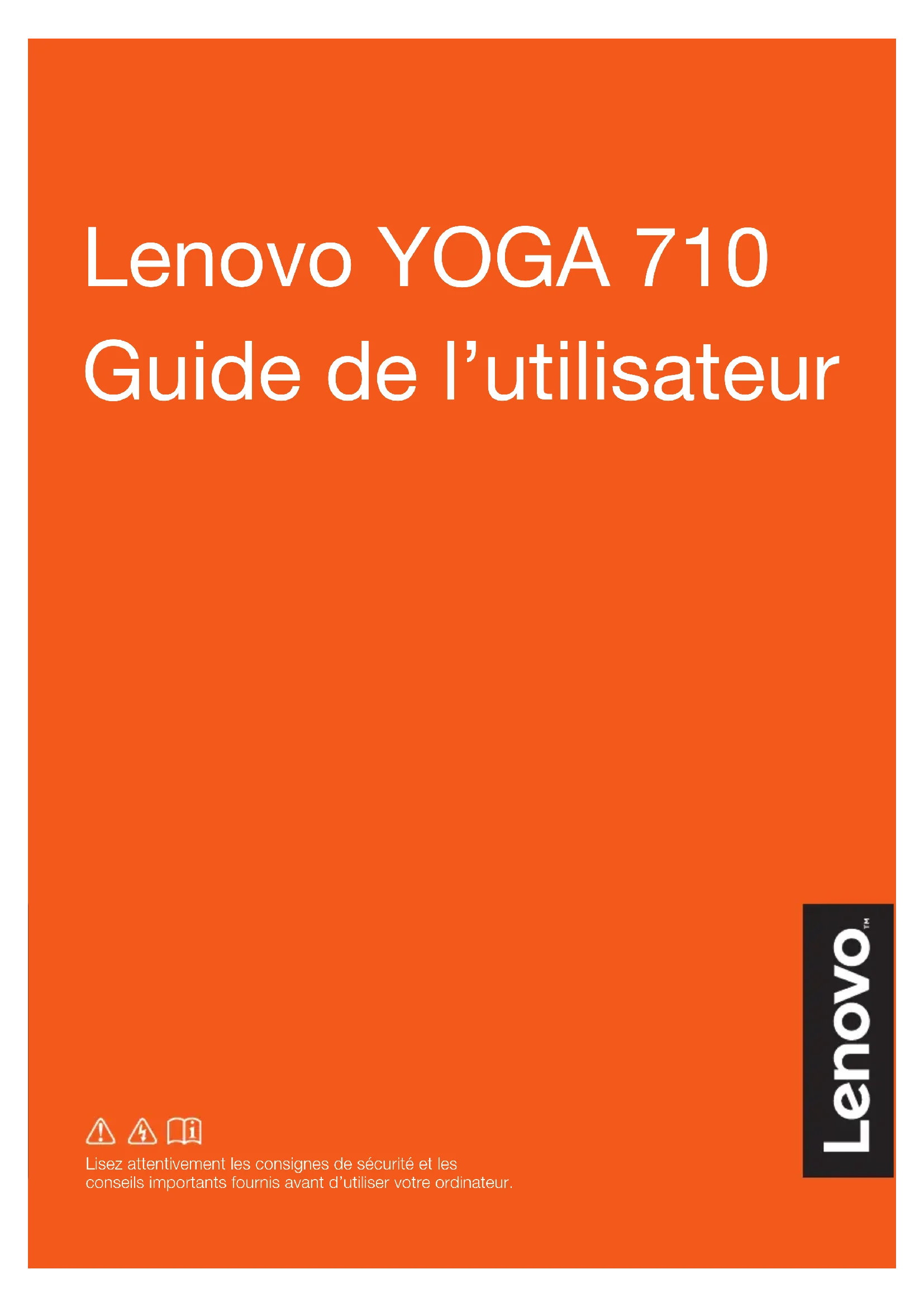Lisez attentivement les consignes de sécurité et les conseils importants fournis avant d’utiliser votre ordinateur. Lenovo YOGA 710 Guide de l’utilisateurPremière édition (mars 2016) © Copyright Lenovo 2016. Avis réglementaire Remarques