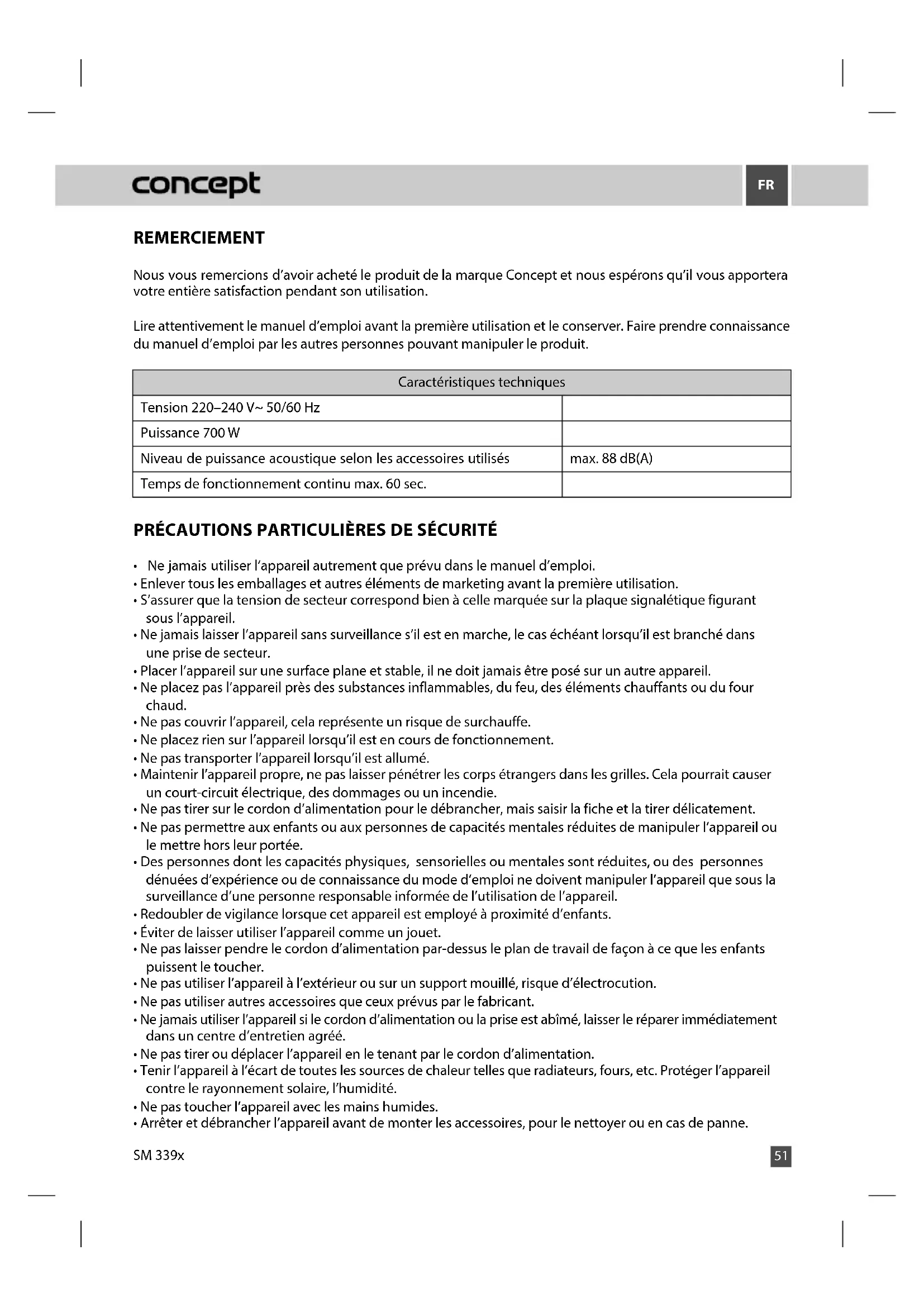 REMERCIEMENT Nous vous remercions d’avoir acheté le produit de la marque Concept et nous espérons qu’il vous apportera votre entière satisfaction pendant son utilisation. Lire attentivement le manuel d’emploi avant la première utilisation et le conserver. Faire prendre connaissance du manuel d’emploi par les autres personnes pouvant manipuler le produit. Caractéristiques techniques Tension 220–240 V~ 50/60 Hz Puissance 700 W Niveau de puissance acoustique selon les accessoires utilisés max. 88 dB(A) Temps de fonctionnement continu max. 60 sec. PRÉCAUTIONS PARTICULIÈRES DE SÉCURITÉ