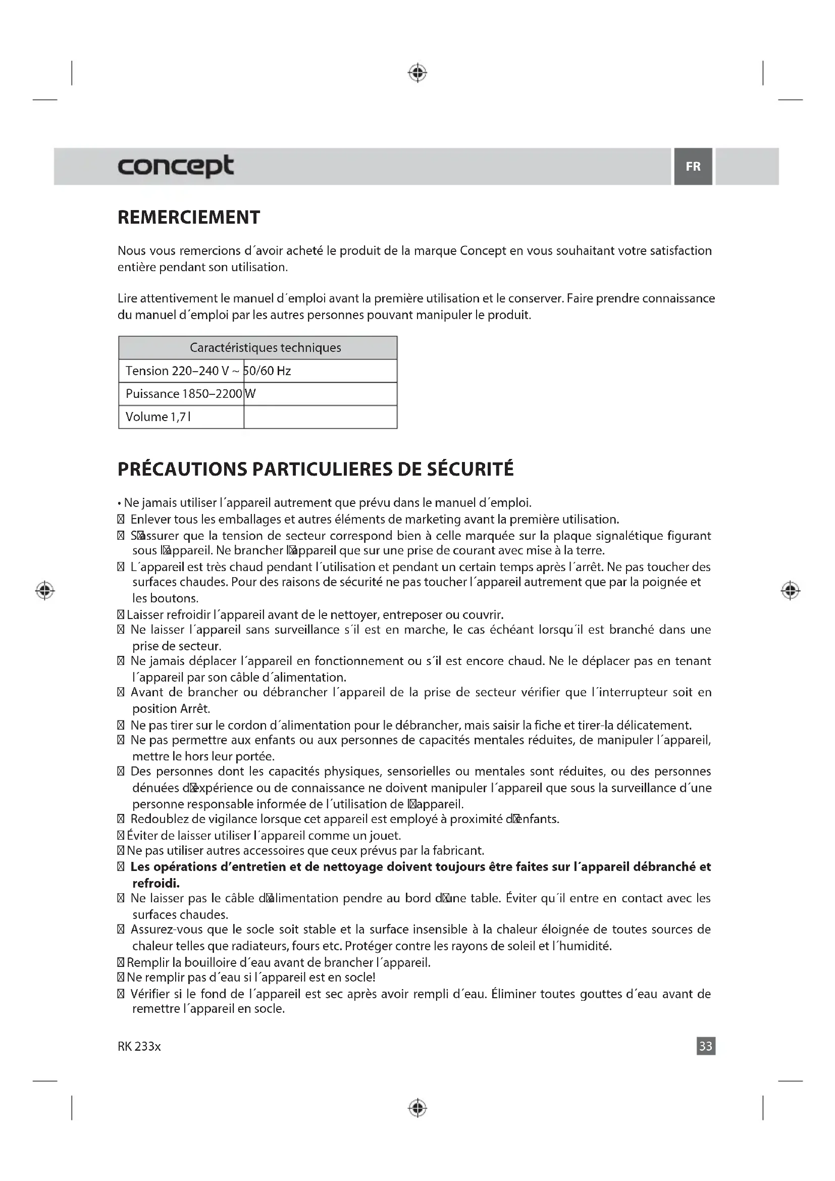 REMERCIEMENT Nous vous remercions d´avoir acheté le produit de la marque Concept en vous souhaitant votre satisfaction entière pendant son utilisation. Lire attentivement le manuel d´emploi avant la première utilisation et le conserver. Faire prendre connaissance du manuel d´emploi par les autres personnes pouvant manipuler le produit. Caractéristiques techniques Tension 220–240 V ~ 50/60 Hz Puissance 1850–2200 W Volume 1,7 l