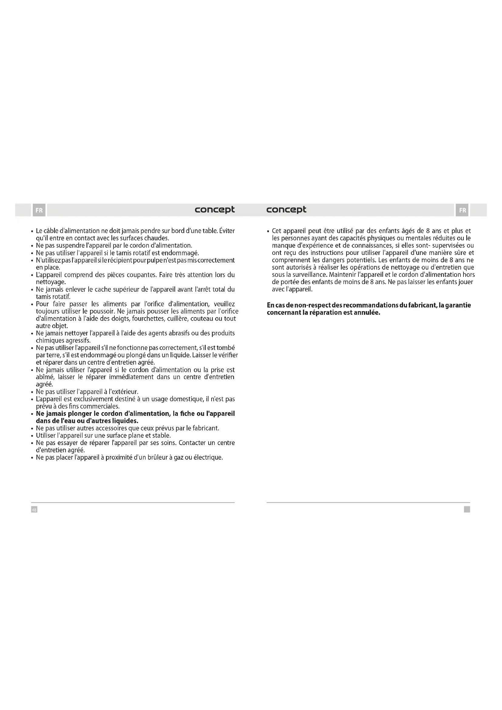 - Cet appareil peut être utilisé par des enfants âgés de 8 ans et plus et les personnes ayant des capacités physiques ou mentales réduites ou le manque d'expérience et de connaissances, si elles sont- supervisées ou ont reçu des instructions pour utiliser l'appareil d'une manière sûre et comprennent les dangers potentiels. Les enfants de moins de 8 ans ne sont autorisés à réaliser les opérations de nettoyage ou d'entretien que sous la surveillance. Maintenir l'appareil et le cordon d'alimentation hors de portée des enfants de moins de 8 ans. Ne pas laisser les enfants jouer avec l'appareil. En cas de non-respect des recommandations du fabricant, la garantie concernant la réparation est annulée.50 51 FRFR