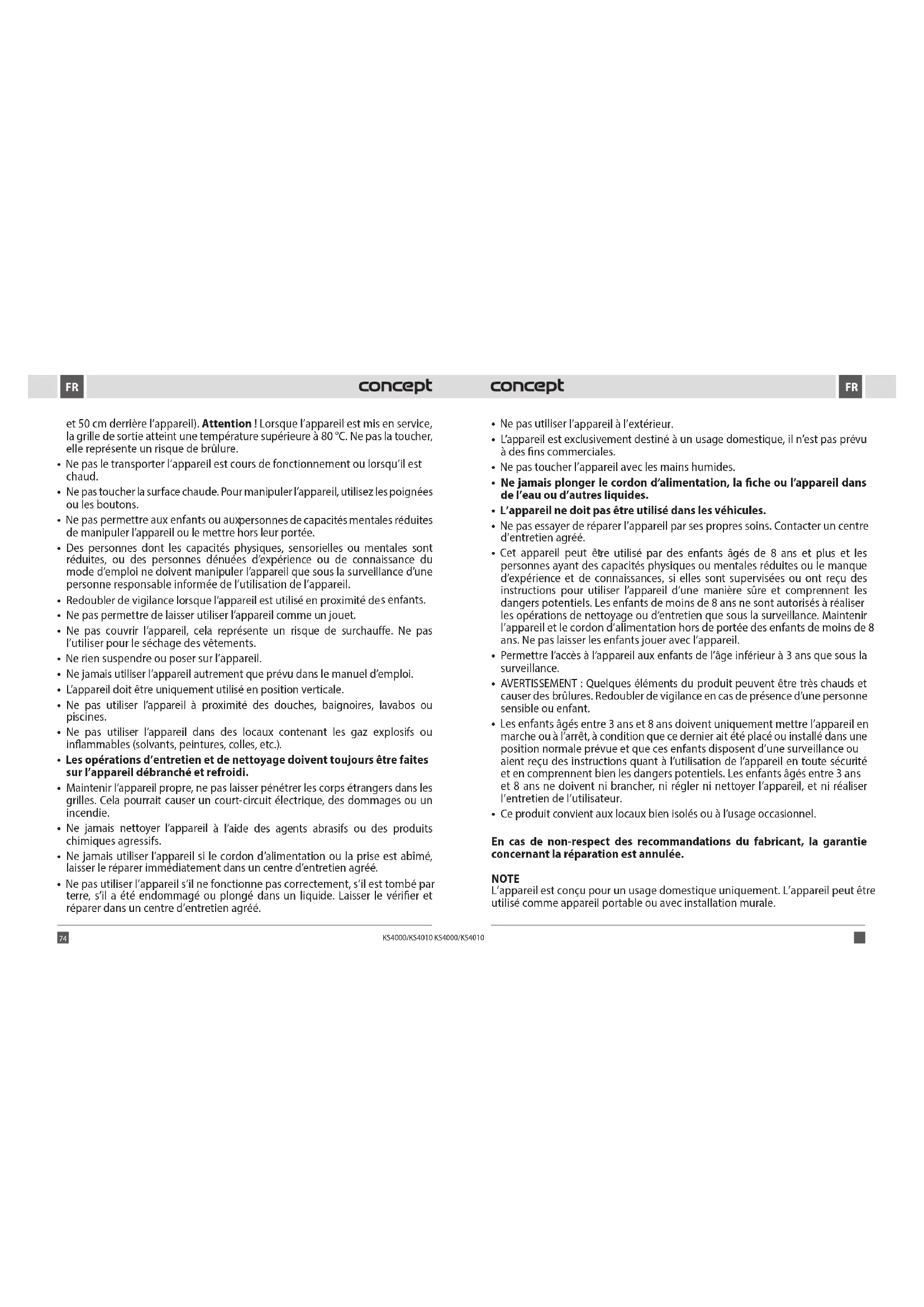 - Ce produit convient aux locaux bien isolés ou à l’usage occasionnel. En cas de non-respect des recommandations du fabricant, la garantie concernant la réparation est annulée. NOTE L’appareil est conçu pour un usage domestique uniquement. L’appareil peut être utilisé comme appareil portable ou avec installation murale.76 77 KS4000/KS4010 KS4000/KS4010 FRFR