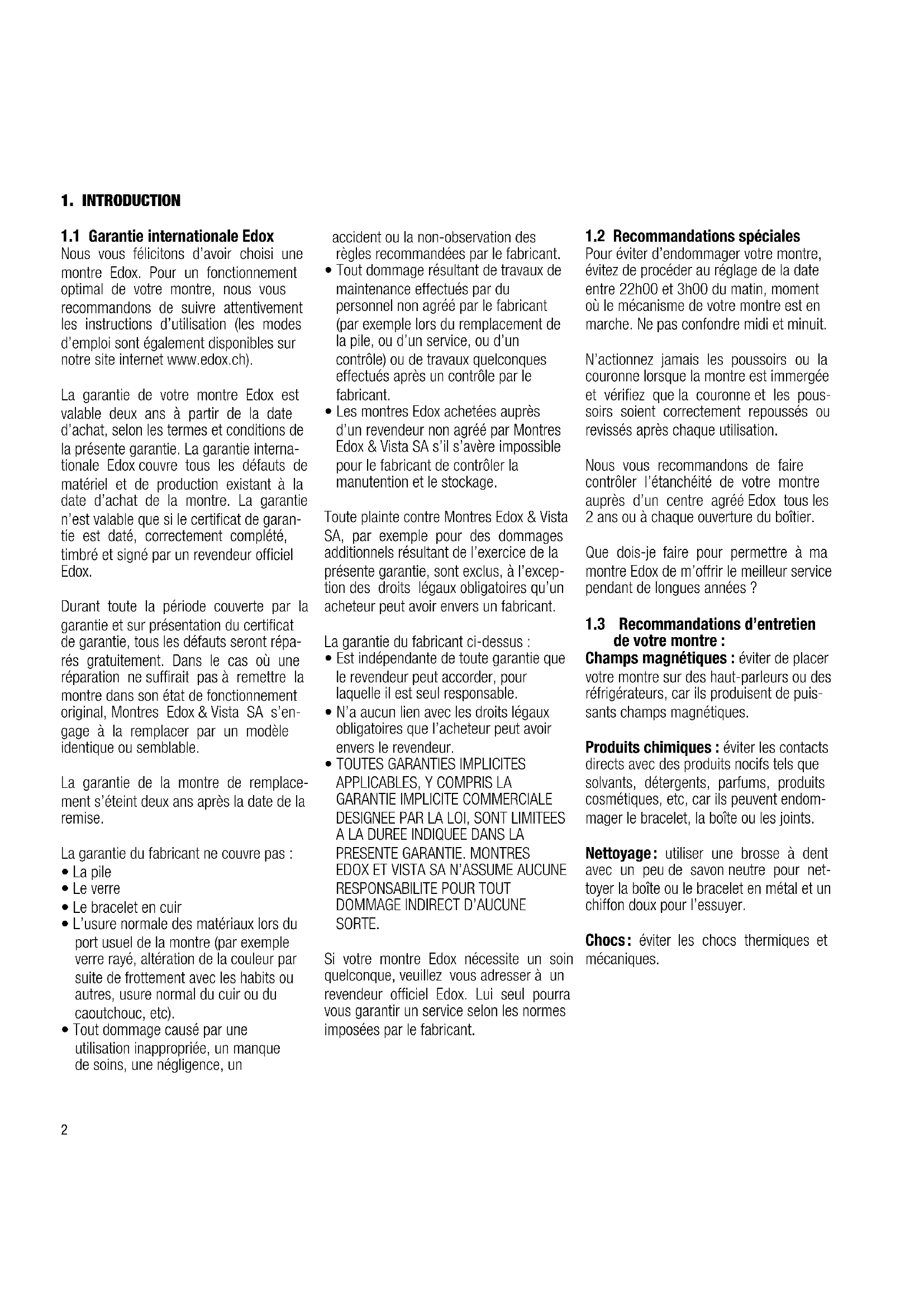 Nous vous félicitons d’avoir choisi une montre Edox. Pour un fonctionnement optimal de votre montre, nous vous recommandons de suivre attentivement les instructions d’utilisation (les modes d’emploi sont également disponibles sur notre site internet www.edox.ch). La garantie de votre montre Edox est valable deux ans à partir de la date d’achat, selon les termes et conditions de la présente garantie. La garantie interna- tionale Edox couvre tous les défauts de matériel et de production existant à la date d’achat de la montre. La garantie n’est valable que si le certificat de garan- tie est daté, correctement complété, timbré et signé par un revendeur officiel Edox. Durant toute la période couverte par la garantie et sur présentation du certificat de garantie, tous les défauts seront répa- rés gratuitement. Dans le cas où une réparation ne suffirait pas à remettre la montre dans son état de fonctionnement original, Montres Edox & Vista SA s’en- gage à la remplacer par un modèle identique ou semblable. La garantie de la montre de remplace- ment s’éteint deux ans après la date de la remise. La garantie du fabricant ne couvre pas :