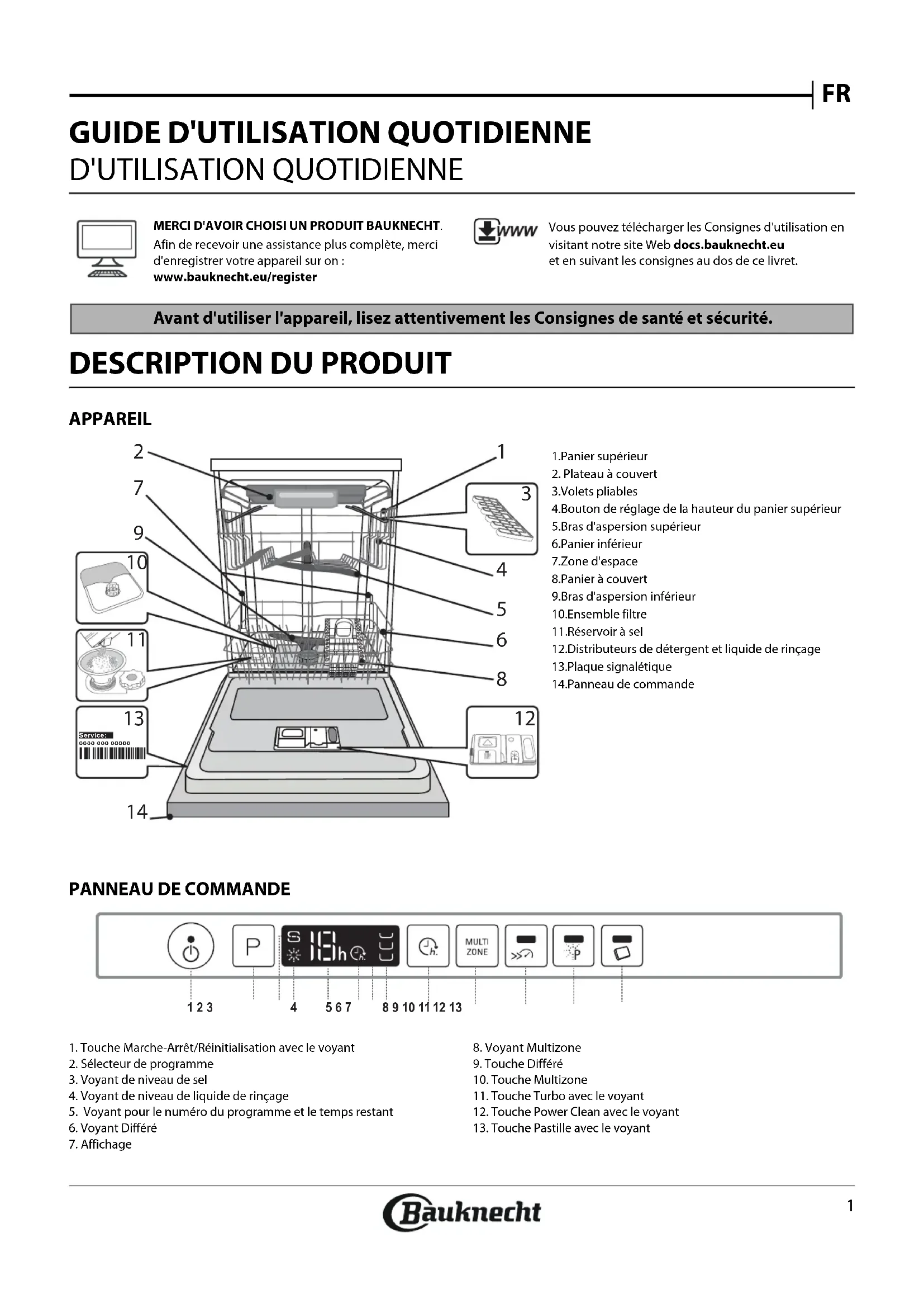 D'UTILISATION QUOTIDIENNE MERCI D'AVOIR CHOISI UN PRODUIT BAUKNECHT. Afin de recevoir une assistance plus complète, merci d'enregistrer votre appareil sur on :www.bauknecht.eu/registerVous pouvez télécharger les Consignes d'utilisation en visitant notre site Web docs.bauknecht.euet en suivant les consignes au dos de ce livret. Avant d'utiliser l'appareil, lisez attentivement les Consignes de santé et sécurité.