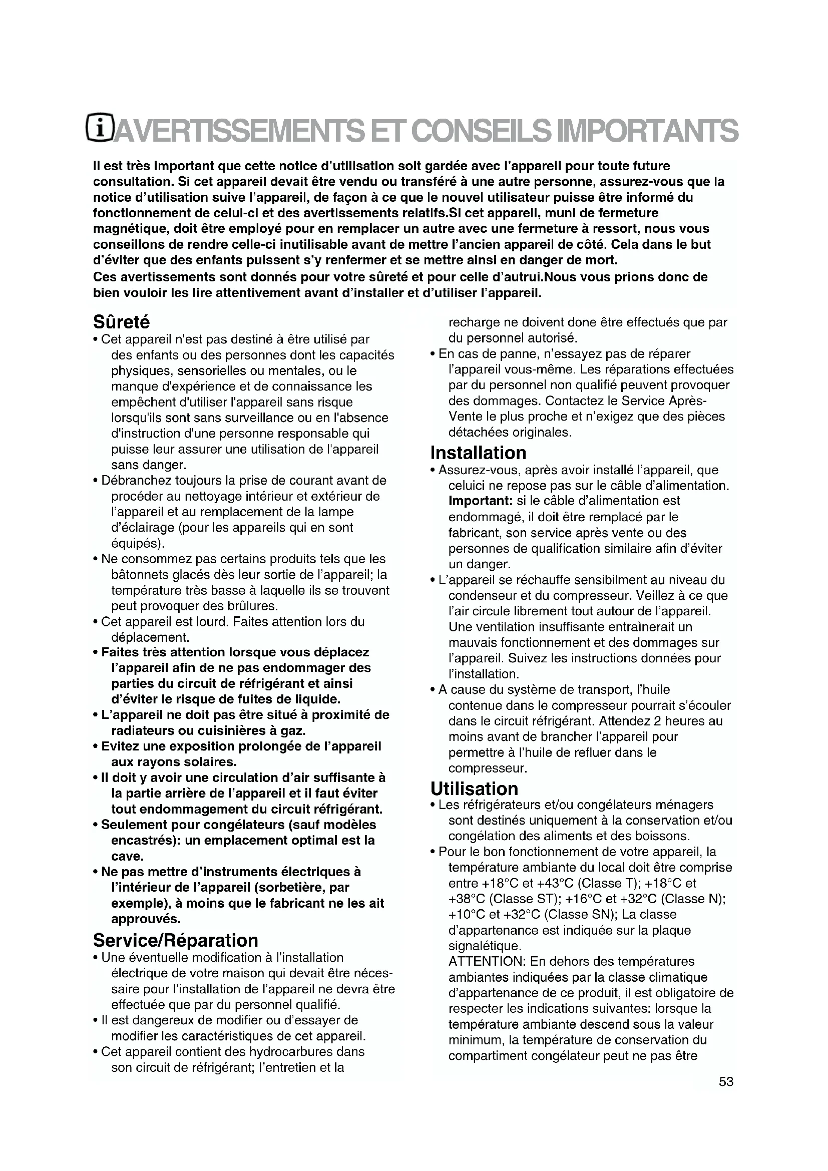 - Pour le bon fonctionnement de votre appareil, la température ambiante du local doit être comprise entre +18°C et +43°C (Classe T); +18°C et +38°C (Classe ST); +16°C et +32°C (Classe N); +10°C et +32°C (Classe SN); La classe d’appartenance est indiquée sur la plaque signalétique. ATTENTION: En dehors des températures ambiantes indiquées par la classe climatique d’appartenance de ce produit, il est obligatoire de respecter les indications suivantes: lorsque la température ambiante descend sous la valeur minimum, la température de conservation du compartiment congélateur peut ne pas être54 SOMMAIRE Avertissements et conseils importants . . . . . . . . . . . . . . . . . . . . . . . . . . . . . . . . . . . . . . . . . . . . . .53 Renseignements pour l’élimination des matériaux d’emballage . . . . . . . . . . . . . . . . . . . . . . . . . .54 Utilisation - Nettoyage - Bandeau de commande - Afficheur . . . . . . . . . . . . . . . . . . . . . . . . . . . . . . .55 Functionnement - Visualisation des températures - Activation des functions - La fonction Shopping 56 Utilisation - Arrêt pour clayettes . . . . . . . . . . . . . . . . . . . . . . . . . . . . . . . . . . . . . . . . . . . . . . . . . . . . . . . .56 Tablettes amovibles - Positionnement des balconnets de la contre-porteBrassage de l’air A.S.P. . . . . . .57 Congélation rapide - Alarme de température - Décongélation -Glaçons - . . . . . . . . . . . . . . . . . . . . . . . . . Conservation des produits surgelés - . . . . . . . . . . . . . . . . . . . . . . . . . . . . . . . . . . . . . . . . . . . . . . . . . . .58 Conseils - Conseils pour la réfrigeration - Conseils pour la congélation - Conseils pour la surgélation . Entretien - Arrêt prolongé . . . . . . . . . . . . . . . . . . . . . . . . . . . . . . . . . . . . . . . . . . . . . . . . . . . . . . . . . .59 Entretien - Nettoyage - Changement de l’ampoule - Dégivrage . . . . . . . . . . . . . . . . . . . . . . . . . . . . .60 Anomalie de fonctionnement - Installation - Emplacement - Branchement électrique . . . . . . . . .61 Installation - Réversibilité de la porte - Instructions pour l’encastrement . . . . . . . . . . . . . . . . . . . . . .62 Déclaration de conditions de garantie . . . . . . . . . . . . . . . . . . . . . . . . . . . . . . . . . . . . . . . . . . . . . . .66