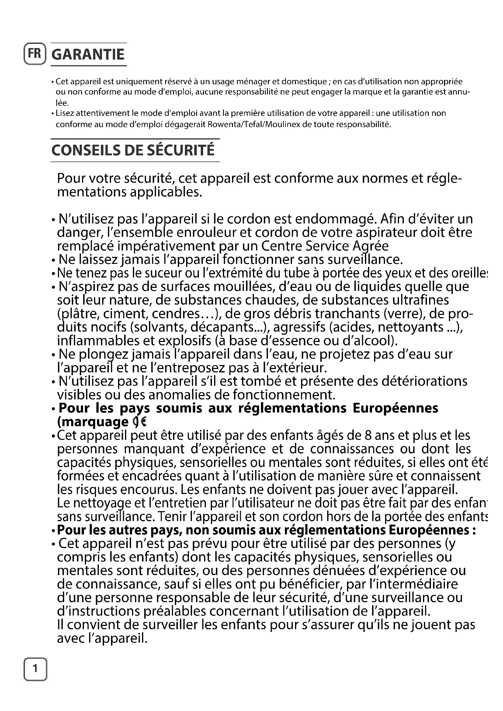 - Lisez attentivement le mode d’emploi avant la première utilisation de votre appareil : une utilisation non conforme au mode d’emploi dégagerait Rowenta/Tefal/Moulinex de toute responsabilité.