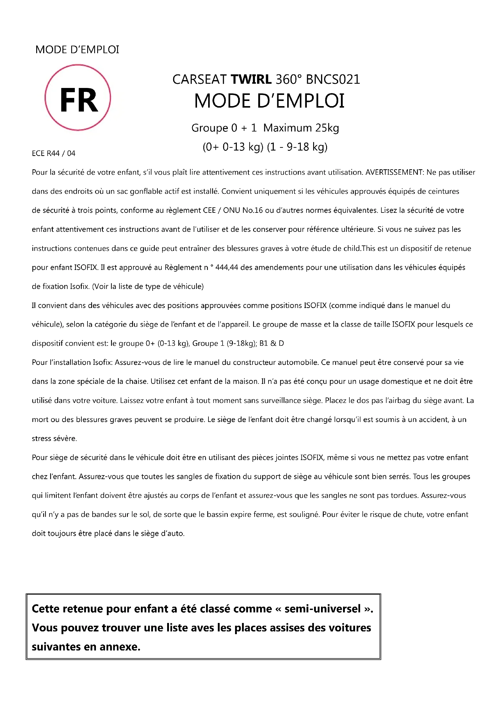 Groupe 0 + 1 Maximum 25kg (0+ 0-13 kg) (1 - 9-18 kg) ECE R44 / 04 Pour la sécurité de votre enfant, s’il vous plaît lire attentivement ces instructions avant utilisation. AVERTISSEMENT: Ne pas utiliser dans des endroits où un sac gonable actif est installé. Convient uniquement si les véhicules approuvés équipés de ceintures de sécurité à trois points, conforme au règlement CEE / ONU No.16 ou d’autres normes équivalentes. Lisez la sécurité de votre enfant attentivement ces instructions avant de l’utiliser et de les conserver pour référence ultérieure. Si vous ne suivez pas les instructions contenues dans ce guide peut entraîner des blessures graves à votre étude de child.This est un dispositif de retenue pour enfant ISOFIX. Il est approuvé au Règlement n ° 444,44 des amendements pour une utilisation dans les véhicules équipés de xation Isox. (Voir la liste de type de véhicule) Il convient dans des véhicules avec des positions approuvées comme positions ISOFIX (comme indiqué dans le manuel du véhicule), selon la catégorie du siège de l’enfant et de l’appareil. Le groupe de masse et la classe de taille ISOFIX pour lesquels ce dispositif convient est: le groupe 0+ (0-13 kg), Groupe 1 (9-18kg); B1 & D Pour l’installation Isox: Assurez-vous de lire le manuel du constructeur automobile. Ce manuel peut être conservé pour sa vie dans la zone spéciale de la chaise. Utilisez cet enfant de la maison. Il n’a pas été conçu pour un usage domestique et ne doit être utilisé dans votre voiture. Laissez votre enfant à tout moment sans surveillance siège. Placez le dos pas l’airbag du siège avant. La mort ou des blessures graves peuvent se produire. Le siège de l’enfant doit être changé lorsqu’il est soumis à un accident, à un stress sévère. Pour siège de sécurité dans le véhicule doit être en utilisant des pièces jointes ISOFIX, même si vous ne mettez pas votre enfant chez l’enfant. Assurez-vous que toutes les sangles de xation du support de siège au véhicule sont bien serrés. Tous les groupes qui limitent l’enfant doivent être ajustés au corps de l’enfant et assurez-vous que les sangles ne sont pas tordues. Assurez-vous qu’il n’y a pas de bandes sur le sol, de sorte que le bassin expire ferme, est souligné. Pour éviter le risque de chute, votre enfant doit toujours être placé dans le siège d’auto. Cette retenue pour enfant a été classé comme « semi-universel ». Vous pouvez trouver une liste aves les places assises des voitures suivantes en annexe.SIÈGE DE VOITURE TWIRL 360° La plus grande caractéristique de ce produit est une rotation de 360 degrés de la retenue pour enfant, augmentant ainsi la difculté d’installer un enfant est considérablement réduit. Le poids ultra léger du produit, il est plus facile pour les parents à installer et à transporter. Ce produit est équipé Isox avancé installé sur le siège de voiture à l’aide d’ancrage ISOFIX que la commodité est plus stable et plus sûr. Ce produit est également équipé d’un dispositif anti-rotation. Le dispositif est constitué d’une jambe de support qui est destinée à limiter la rotation de la sécurité lors d’un choc frontal. Avec système de sécurité pour la protection latérale pour protéger la tête des enfants, les augmentations d’atténuation anquant l’impact anti-côté avancé et rencontre le dernier I-SIZE zijbeveiligingsbehoeften. Le système a un chemin doux et antischid dans le HASP et la poitrine, ce qui rend l’enfant à se sentir plus à l’aise. La housse en tissu est lavable, ignifuge, protection de l’environnement et de la mode. Rotating 360 Group 1(9-18kg) Group 0+(0-13kg)MODE D’EMPLOI AVERTISSEMENT DE SÉCURITÉ: Lisez la sécurité de votre enfant attentivement ces instructions avant de l’utiliser et de les conserver pour référence ultérieure. Si vous ne suivez pas les instructions contenues dans ce guide peut entraîner des blessures graves à votre enfant. La chaise peut être utilisé uniquement avec le harnais pour les enfants de moins de 18 kg en poids (groupe 0 +, 0-13 kg, Groupe 1, 9-18 kg). Ne pas surcharger la chaise plus d’un enfant ou avec d’autres charges. Pour l’installation Isox: Assurez-vous de lire le manuel du constructeur automobile. Ce manuel peut être conservé pour sa vie dans la zone spéciale de la chaise. Utilisez cet enfant de la maison. Il n’a pas été conçu pour un usage domestique et ne doit être utilisé dans votre voiture. Laissez votre enfant à tout moment sans surveillance siège. Placez le dos pas l’airbag du siège avant. La mort ou des blessures graves peuvent se produire. Le siège de l’enfant doit être changé lorsqu’il est soumis à un accident, à un stress sévère. Pour chaise de sécurité dans le véhicule doit être en utilisant des pièces jointes ISOFIX, même si vous ne mettez pas votre enfant chez l’enfant. Assurez-vous que toutes les sangles de xation du support de siège au véhicule sont bien serrés. Tous les groupes qui limitent l’enfant doivent être ajustés au corps de l’enfant et assurez-vous que les sangles ne sont pas tordues. Assurez-vous qu’il n’y a pas de bandes sur le sol, de sorte que le bassin expire ferme, est souligné. Tous les bagages ou autres objets qui pourraient causer des dommages de collision solidement xés. Les pièces rigides et les pièces en matière plastique d’un dispositif de sécurité pour enfants doivent être placés et installés qu’ils ne sont pas susceptibles de se xe l’utilisation quotidienne du véhicule par un siège mobile ou dans une porte du véhicule. Il est dangereux d’apporter des modications ou des ajouts à l’appareil sans l’autorisation de l’autorité compétente et le danger pour les instructions d’installation fournies par le fabricant de verrouillage de l’enfant, de ne pas suivre. Ce siège est conçu pour les enfants de la na