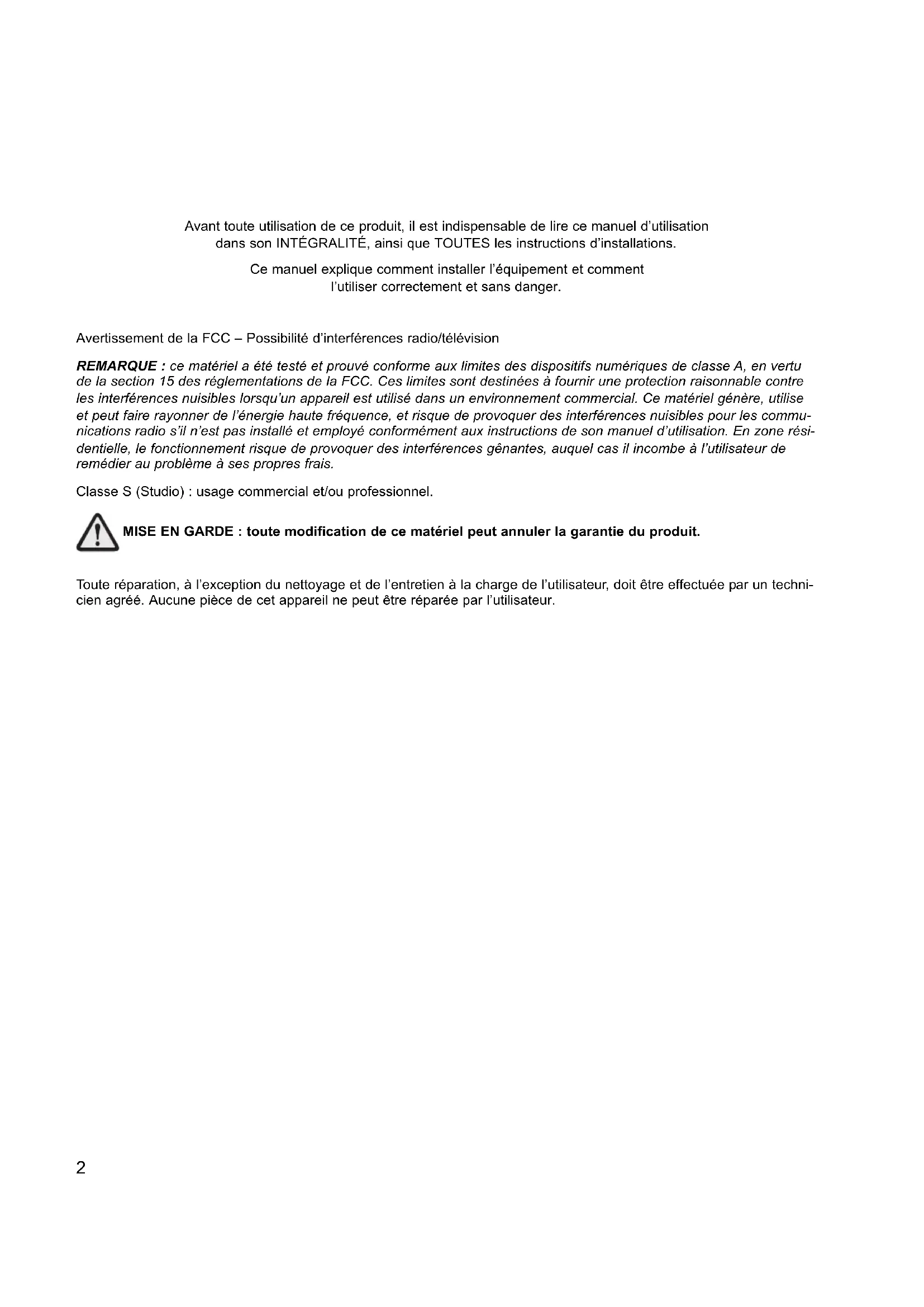 UREAUX INTERNATIONAUXAvant toute utilisation de ce produit, il est indispensable de lire ce manuel d’utilisation dans son INTÉGRALITÉ, ainsi que TOUTES les instructions d’installations. Ce manuel explique comment installer l’équipement et comment l’utiliser correctement et sans danger. Avertissement de la FCC – Possibilité d’interférences radio/télévision REMARQUE : ce matériel a été testé et prouvé conforme aux limites des dispositifs numériques de classe A, en vertu de la section 15 des réglementations de la FCC. Ces limites sont destinées à fournir une protection raisonnable contre les interférences nuisibles lorsqu’un appareil est utilisé dans un environnement commercial. Ce matériel génère, utilise et peut faire rayonner de l’énergie haute fréquence, et risque de provoquer des interférences nuisibles pour les commu- nications radio s’il n’est pas installé et employé conformément aux instructions de son manuel d’utilisation. En zone rési- dentielle, le fonctionnement risque de provoquer des interférences gênantes, auquel cas il incombe à l’utilisateur de remédier au problème à ses propres frais. Classe S (Studio) : usage commercial et/ou professionnel. MISE EN GARDE : toute modification de ce matériel peut annuler la garantie du produit. Toute réparation, à l’exception du nettoyage et de l’entretien à la charge de l’utilisateur, doit être effectuée par un techni- cien agréé. Aucune pièce de cet appareil ne peut être réparée par l’utilisateur.