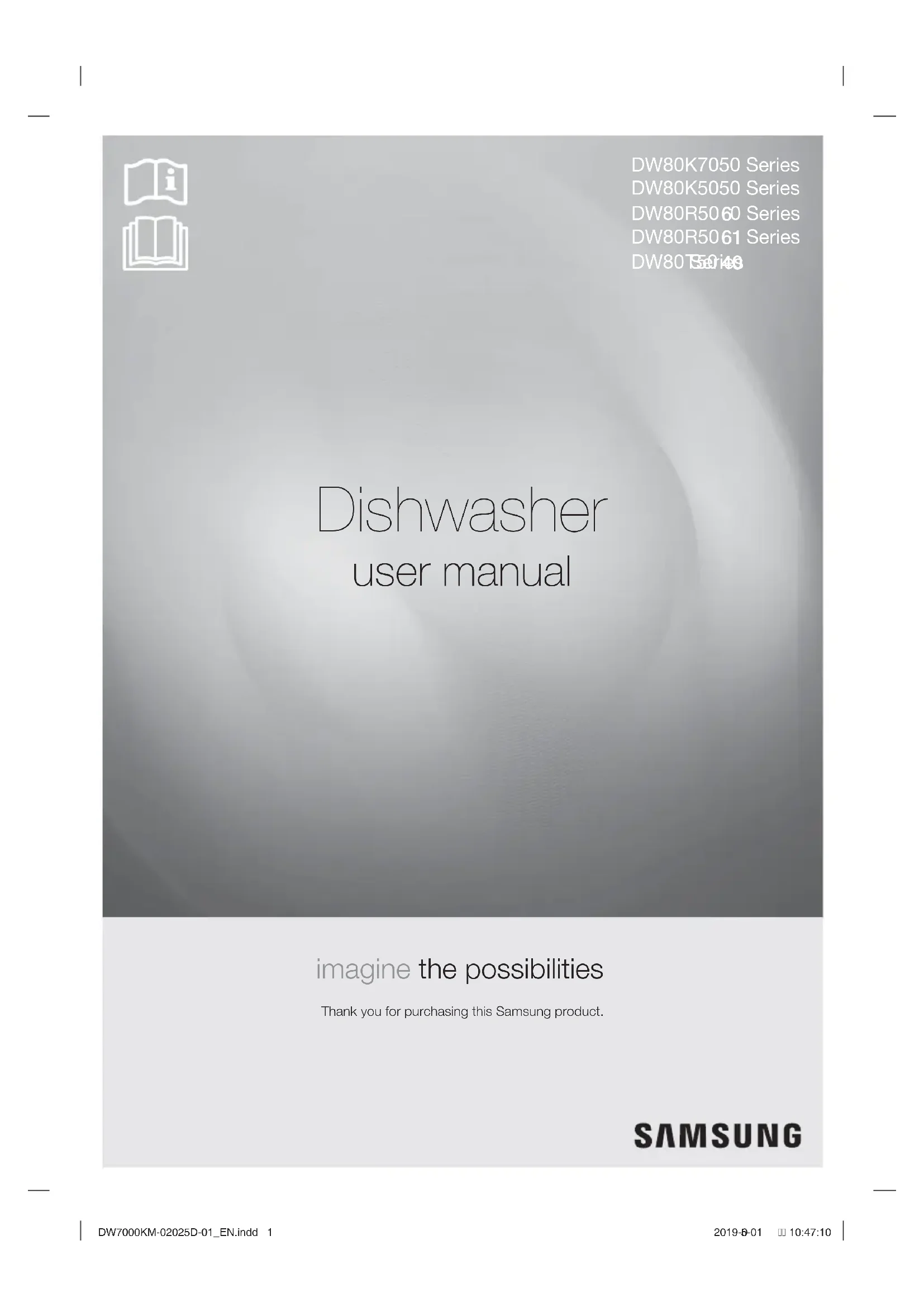 9 5 1Lave-vaisselle manuel d'utilisation un monde de possibilités Nous vous remercions d'avoir choisi ce produit Samsung.Série DW80K7050Série DW80K5050 DW7000KM-02025B-01_CFR.indd 1DW7000KM-02025D-01_CFR.indd 1 2016 11:32:21 AM201 11:32:21A M01/05/ Série Série DW80R50 0 DW80R50