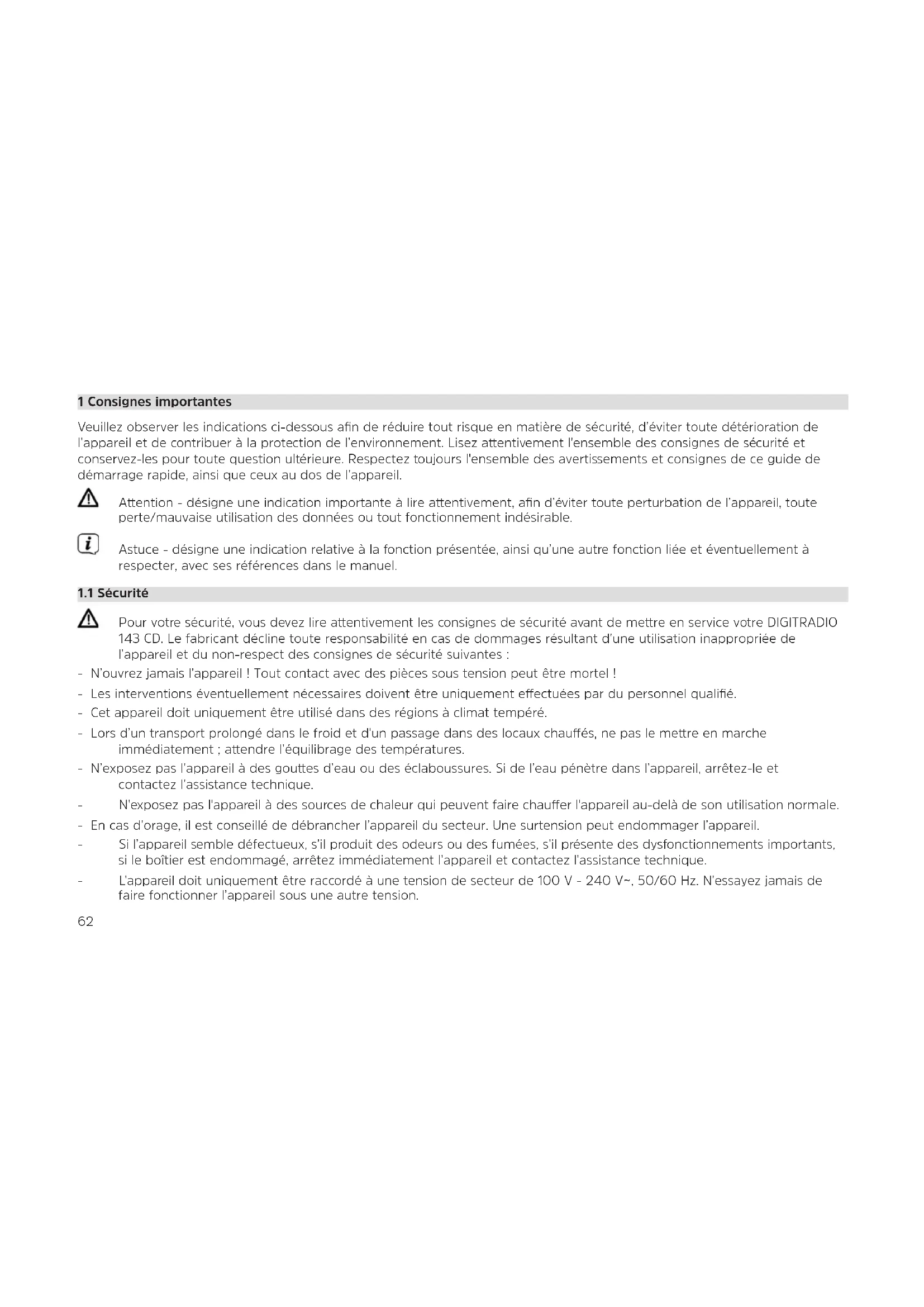 Pour votre sécurité, vous devez lire aentivement les consignes de sécurité avant de mere en service votre DIGITRADIO 143 CD. Le fabricant décline toute responsabilité en cas de dommages résultant d’une utilisation inappropriée de l’appareil et du non-respect des consignes de sécurité suivantes : - N’ouvrez jamais l’appareil! Tout contact avec des pièces sous tension peut être mortel ! - Les interventions éventuellement nécessaires doivent être uniquement eectuées par du personnel qualifié. - Cet appareil doit uniquement être utilisé dans des régions à climat tempéré. - Lors d’un transport prolongé dans le froid et d'un passage dans des locaux chaués, ne pas le mere en marche immédiatement; aendre l’équilibrage des températures. - N’exposez pas l’appareil à des goues d’eau ou des éclaboussures. Si de l’eau pénètre dans l’appareil, arrêtez-le et contactez l’assistance technique. - N'exposez pas l'appareil à des sources de chaleur qui peuvent faire chauer l'appareil au-delà de son utilisation normale. - En cas d’orage, il est conseillé de débrancher l’appareil du secteur. Une surtension peut endommager l’appareil. - Si l’appareil semble défectueux, s’il produit des odeurs ou des fumées, s’il présente des dysfonctionnements importants, si le boîtier est endommagé, arrêtez immédiatement l’appareil et contactez l’assistance technique. - L'appareil doit uniquement être raccordé à une tension de secteur de 100 V - 240 V~, 50/60 Hz. N’essayez jamais de faire fonctionner l’appareil sous une autre tension.63