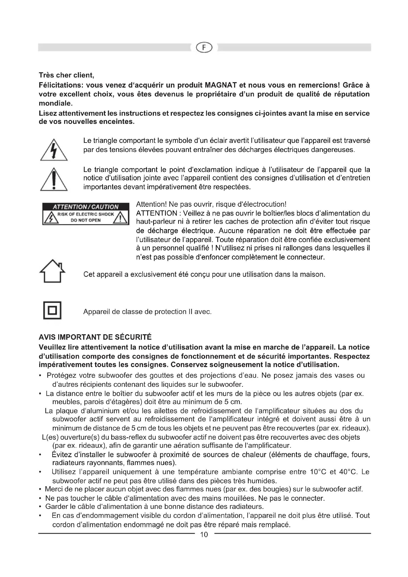 Cross-over frequency control (4) Used to set the upper limit of the subwoofer operating range. The cross-over frequency should be set to 40 to 120 Hz when the system is used in combination with shelf loudspeakers or 50 to 100 Hz when used with stand loudspeakers. Phase regulator (3) In normal use the phase control should be set to 0°. However, in rare cases it may be advantageous to vary the phase to between 0 and 180° (e.g. if the subwoofer is far away from the front satellites or in the event of unfavourable acoustics in the room). Generally speaking: the setting where the lower base tone area has a more natural sound is the correct one. MAINTENANCE The surface is best cleaned with a mild household cleaner. On no account use furniture polish or similar products. SPECIFICATIONS Configuration: bass reflex subwoofer, ‘Frontfire’ Fitted with 30 cm long-stroke driver Output power RMS/Max.: 140 / 280 watts Frequency range: 20 – 200 Hz Cross-over frequency: 40 – 120 Hz, adjustable Dimensions (WxHxD): 355 x 475 x 435 mm Accessories: mains cable Subject to technical change.10 Très cher client, Félicitations: vous venez d‘acquérir un produit MAGNAT et nous vous en remercions! Grâce à votre excellent choix, vous êtes devenus le propriétaire d’un produit de qualité de réputation mondiale. Lisez attentivement les instructions et respectez les consignes ci-jointes avant la mise en service de vos nouvelles enceintes. Le triangle comportant le symbole d‘un éclair avertit l’utilisateur que l’appareil est traversé par des tensions élevées pouvant entraîner des décharges électriques dangereuses. Le triangle comportant le point d‘exclamation indique à l’utilisateur de l’appareil que la notice d’utilisation jointe avec l’appareil contient des consignes d’utilisation et d’entretien importantes devant impérativement être respectées. Attention! Ne pas ouvrir, risque d‘électrocution! ATTENTION : Veillez à ne pas ouvrir le boîtier/les blocs d’alimentation du haut-parleur ni à retirer les caches de protection afin d‘éviter tout risque de décharge électrique. Aucune réparation ne doit être effectuée par l’utilisateur de l’appareil. Toute réparation doit être confiée exclusivement à un personnel qualifié ! N‘utilisez ni prises ni rallonges dans lesquelles il n’est pas possible d‘enfoncer complètement le connecteur. Cet appareil a exclusivement été conçu pour une utilisation dans la maison. Appareil de classe de protection II avec.