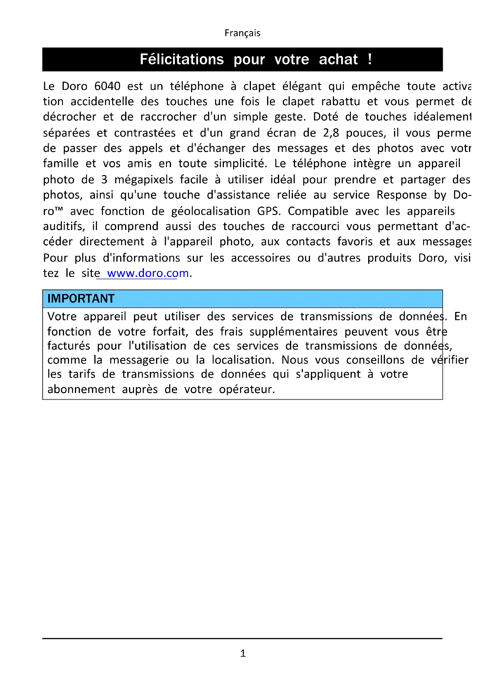- Certificat de conformité Français Félicitations pour votre achat ! Le Doro 6040 est un téléphone à clapet élégant qui empêche toute activa- tion accidentelle des touches une fois le clapet rabattu et vous permet de décrocher et de raccrocher d'un simple geste. Doté de touches idéalement séparées et contrastées et d'un grand écran de 2,8 pouces, il vous permet de passer des appels et d'échanger des messages et des photos avec votre famille et vos amis en toute simplicité. Le téléphone intègre un appareil photo de 3 mégapixels facile à utiliser idéal pour prendre et partager des photos, ainsi qu'une touche d'assistance reliée au service Response by Do- ro™ avec fonction de géolocalisation GPS. Compatible avec les appareils auditifs, il comprend aussi des touches de raccourci vous permettant d'ac- céder directement à l'appareil photo, aux contacts favoris et aux messages. Pour plus d'informations sur les accessoires ou d'autres produits Doro, visi- tez le site www.doro.com. IMPORTANT Votre appareil peut utiliser des services de transmissions de données. En fonction de votre forfait, des frais supplémentaires peuvent vous être facturés pour l'utilisation de ces services de transmissions de données, comme la messagerie ou la localisation. Nous vous conseillons de vérifier les tarifs de transmissions de données qui s'appliquent à votre abonnement auprès de votre opérateur. 1Français Démarrage Mise en place de la carte SIM, de la carte mémoire et de la batterie Retirer le couvercle de la batterie IMPORTANT Attention à ne pas vous abîmer les ongles lorsque vous retirez le couvercle de la batterie. Attention à ne pas tordre ou déformer le couvercle de la batterie, au risque de l'abîmer. Insérez les cartes SIM (obligatoire) Retirez la batterie si elle est déjà installée. Re- pérez le compartiment pour carte SIM et insé- rez-y délicatement la carte. Reportez-vous à l'étiquette située à côté du compartiment pour savoir comment insérer la carte. A. Insérez la première carte SIM en la glis- sant doucement dans le compartiment de la carte SIM1. B. Insérez la seconde carte SIM en la glissant doucement dans le compartiment de la carte SIM2. p. 62