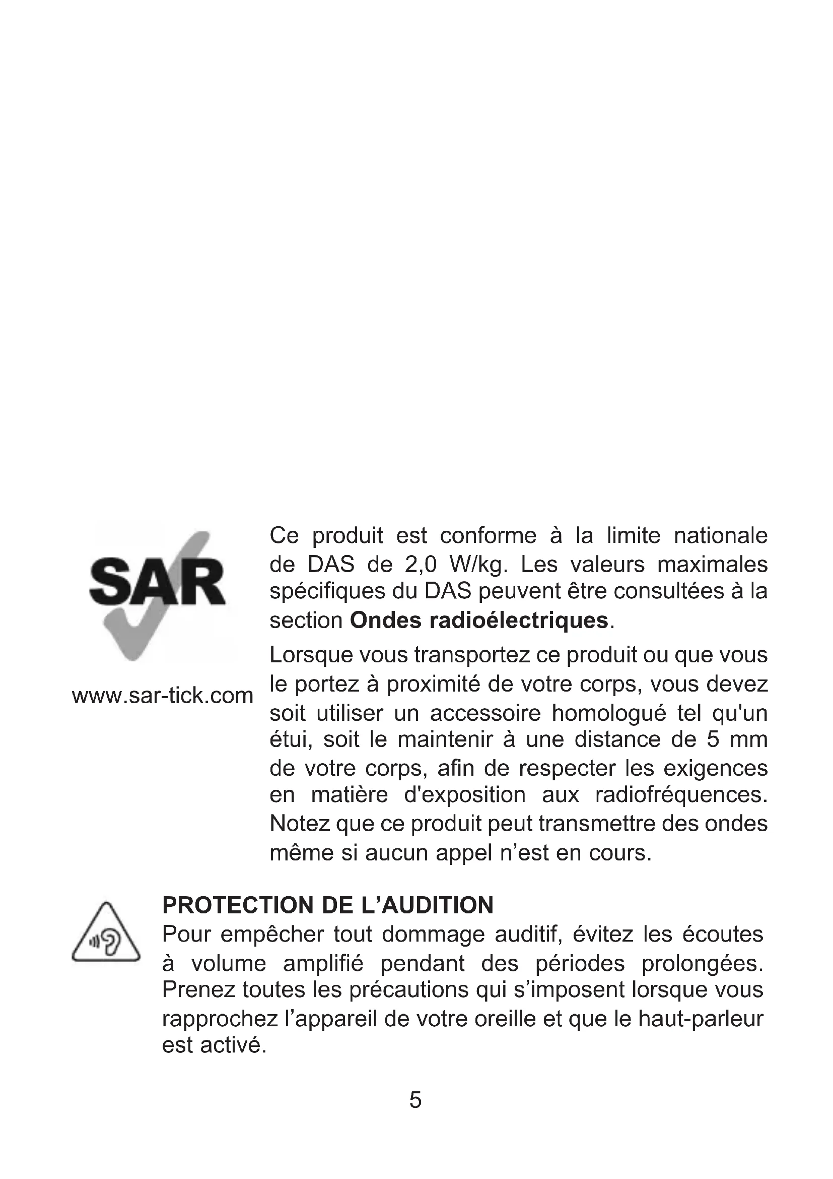 Pour empêcher tout dommage auditif, évitez les écoutes à volume amplifié pendant des périodes prolongées. Prenez toutes les précautions qui s’imposent lorsque vous rapprochez l’appareil de votre oreille et que le haut-parleur est activé. www.sar-tick.com Ce produit est conforme à la limite nationale de DAS de 2,0 W/kg. Les valeurs maximales spécifiques du DAS peuvent être consultées à la section Ondes radioélectriques. Lorsque vous transportez ce produit ou que vous le portez à proximité de votre corps, vous devez soit utiliser un accessoire homologué tel qu'un étui, soit le maintenir à une distance de 5 mm de votre corps, afin de respecter les exigences en matière d'exposition aux radiofréquences. Notez que ce produit peut transmettre des ondes même si aucun appel n’est en cours.6 Précautions d’emploi ................ Avant d’utiliser votre téléphone, lisez ce chapitre avec attention. Le fabricant ne pourra être tenu responsable des conséquences résultant d’une utilisation impropre et/ou non conforme aux instructions contenues dans le manuel.
