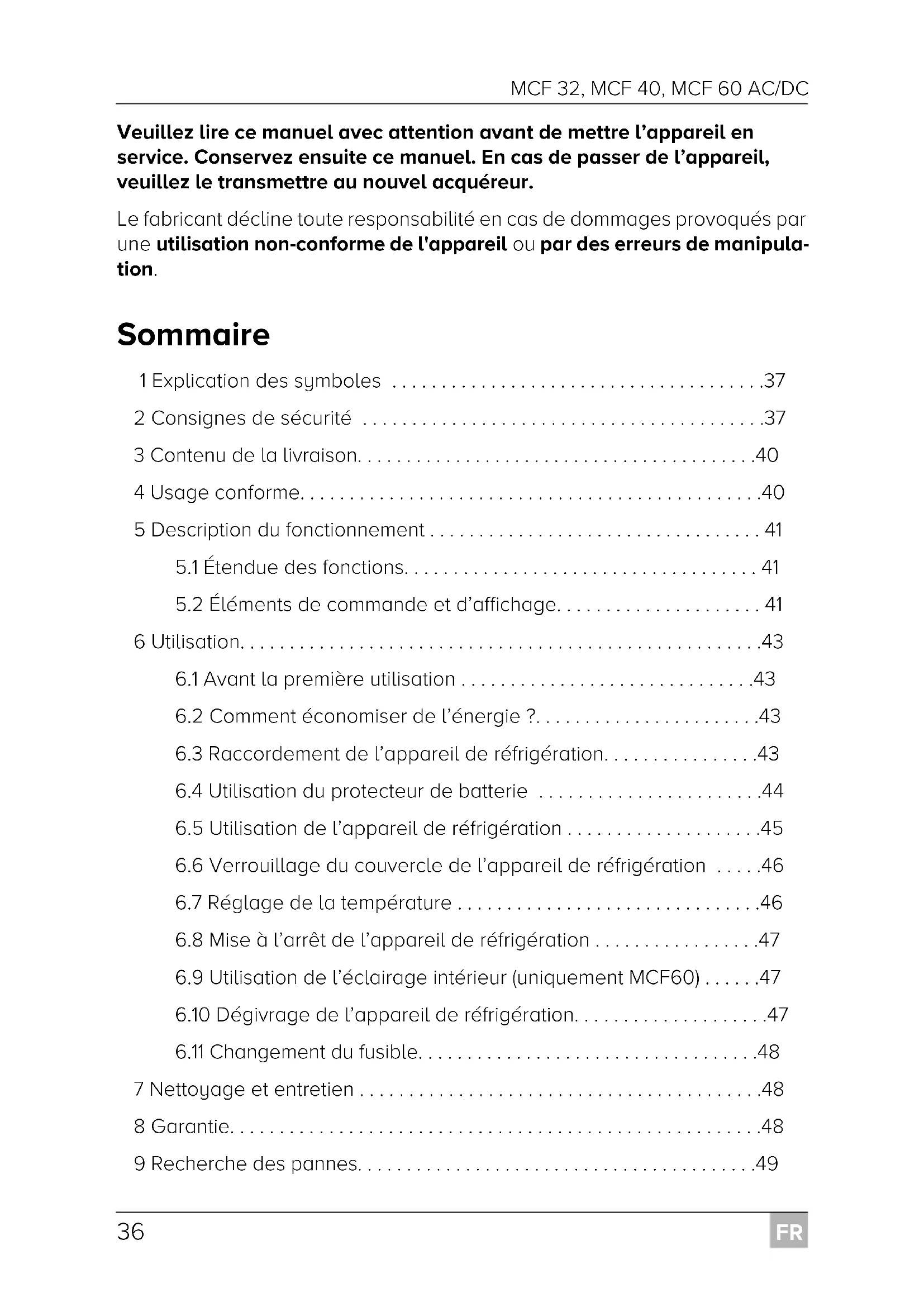 - Veuillez lire ce manuel avec attention avant de mettre l’appareil en service. Conservez ensuite ce manuel. En cas de passer de l’appareil, veuillez le transmettre au nouvel acquéreur. Le fabricant décline toute responsabilité en cas de dommages provoqués par une utilisation non-conforme de l'appareil ou par des erreurs de manipula- tion. Sommaire 1 Explication des symboles p. 37