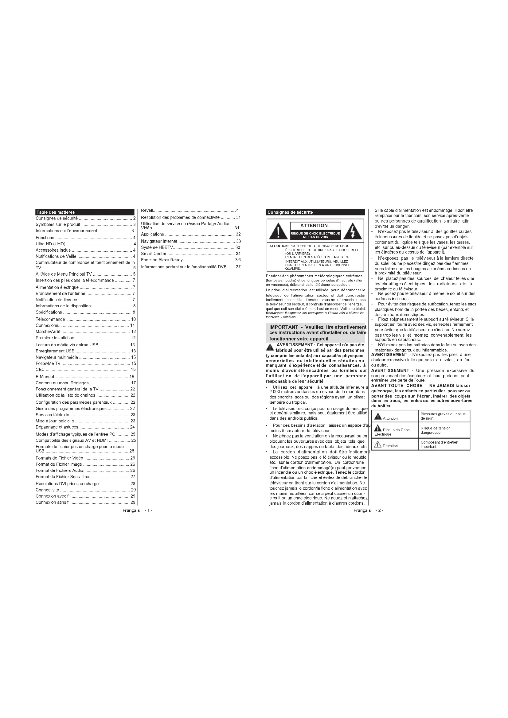 fabriqué pour être utilisé par des personnes (y compris les enfants) aux capacités physiques, sensorielles ou intellectuelles réduites ou manquant d’expérience et de connaissances, à moins d’avoir été encadrées ou formées sur l'utilisation de l'appareil par une personne responsable de leur sécurité. Utilisez cet appareil à une altitude inférieure à 2 000 mètres au-dessus du niveau de la mer, dans des endroits secs ou des régions ayant un climat tempéré ou tropical. Le téléviseur est conçu pour un usage domestique et général similaire, mais peut également être utilisé dans des endroits publics. Pour des besoins d’aération, laissez un espace d’au moins 5 cm autour du téléviseur. Ne gênez pas la ventilation en la recouvrant ou en bloquant les ouvertures avec des objets tels que des journaux, des nappes de table, des rideaux, etc. Le cordon d'alimentation doit être facilement accessible. Ne posez pas le téléviseur ou le meuble, etc., sur le cordon d'alimentation. Un cordon/une fiche d’alimentation endommagé(e) peut provoquer un incendie ou un choc électrique. Tenez le cordon d'alimentation par la fiche et évitez de débrancher le téléviseur en tirant sur le cordon d'alimentation. Ne touchez jamais le cordon/la fiche d’alimentation avec les mains mouillées, car cela peut causer un court- circuit ou un choc électrique. Ne nouez et n'attachez jamais le cordon d'alimentation à d'autres cordons. Si le câble d'alimentation est endommagé, il doit être remplacé par le fabricant, son service après-vente ou des personnes de qualification similaire afin d'éviter un danger. N’exposez pas le téléviseur à des gouttes ou des éclaboussures de liquide et ne posez pas d’objets contenant du liquide tels que les vases, les tasses, etc. sur ou au-dessus du téléviseur (par exemple sur les étagères au-dessus de l’appareil). N’exposez pas le téléviseur à la lumière directe du soleil ou ne placez/ne dirigez pas des flammes nues telles que les bougies allumées au-dessus ou à proximité du téléviseur. Ne placez pas des sources de chaleur telles que les chauffages électriques, les radiateurs, etc. à proximité du téléviseur. Ne posez pas le téléviseur à même le sol et sur des surfaces inclinées. Pour éviter des risques de suffocation, tenez les sacs plastiques hors de la portée des bébés, enfants et des animaux domestiques. Fixez soigneusement le support au téléviseur. Si le support est fourni avec des vis, serrez-les fermement pour éviter que le téléviseur ne s’incline. Ne serrez pas trop les vis et montez convenablement les supports en caoutchouc. N'éliminez pas les batteries dans le feu ou avec des matériaux dangereux ou inflammables. AVERTISSEMENT - N'exposez pas les piles à une chaleur excessive telle que celle du soleil, du feu ou autre. AVERTISSEMENT - Une pression excessive du son provenant des écouteurs et haut-parleurs peut entraîner une perte de l’ouïe. AVANT TOUTE CHOSE – NE JAMAIS laisser quiconque, les enfants en particulier, pousser ou porter des coups sur l’écran, insérer des objets dans les trous, les fentes ou les autres ouvertures du boîtier. Attention Blessures graves ou risque de mort Risque de Choc Électrique Risque de tension dangereuse Entretien Composant d’entretien importantFrançais - 3 - Symboles sur le produit Les symboles suivants sont utilisés sur le produit pour marquer les instructions relatives aux restrictions, aux précautions et à la sécurité. Chaque explication se rapporte uniquement à l'endroit du produit portant le symbole correspondant. Veuillez en tenir compte pour des raisons de sécurité. Équipement de classe II : Cet appareil, de par sa conception, ne nécessite pas de branchement sécurisé à un système électrique de mise à la terre. Borne dangereuse sous tension : Les bornes marquées, dans des conditions normales d'utilisation, sont dangereuses lorsqu'elles sont sous tension.