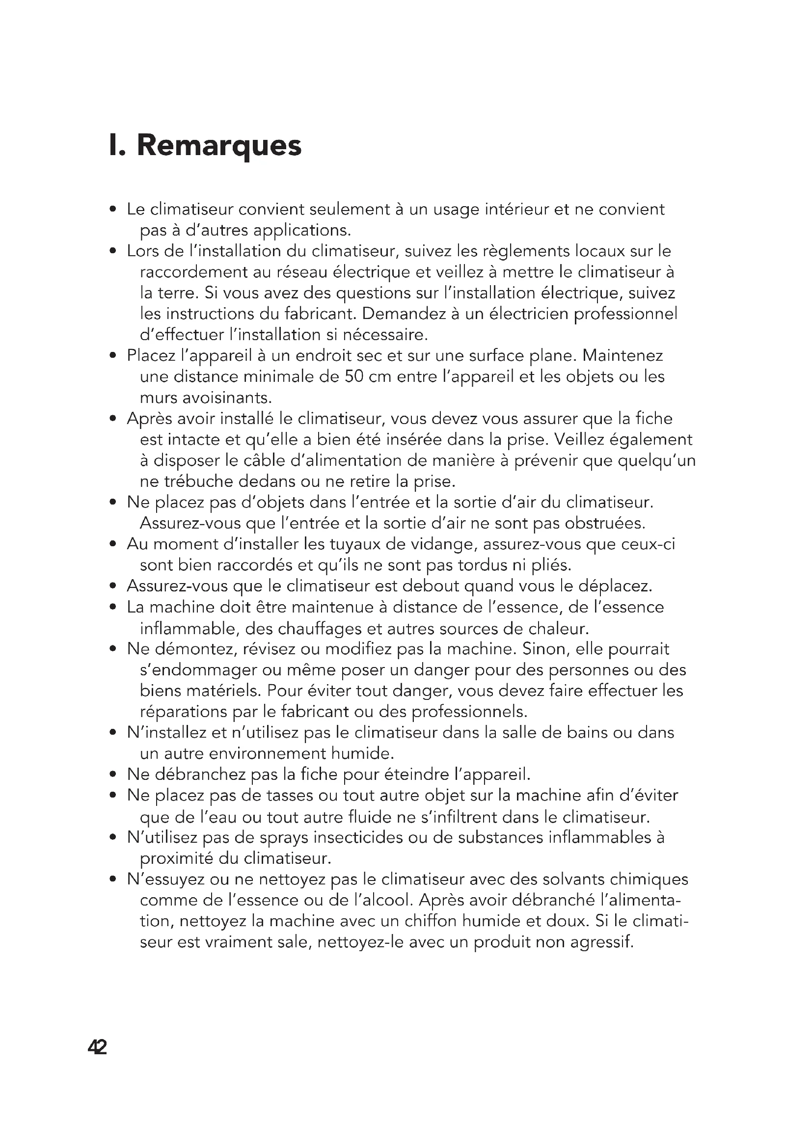 - N’essuyez ou ne nettoyez pas le climatiseur avec des solvants chimiques comme de l’essence ou de l’alcool. Après avoir débranché l’alimenta- tion, nettoyez la machine avec un chiffon humide et doux. Si le climati- seur est vraiment sale, nettoyez-le avec un produit non agressif.43