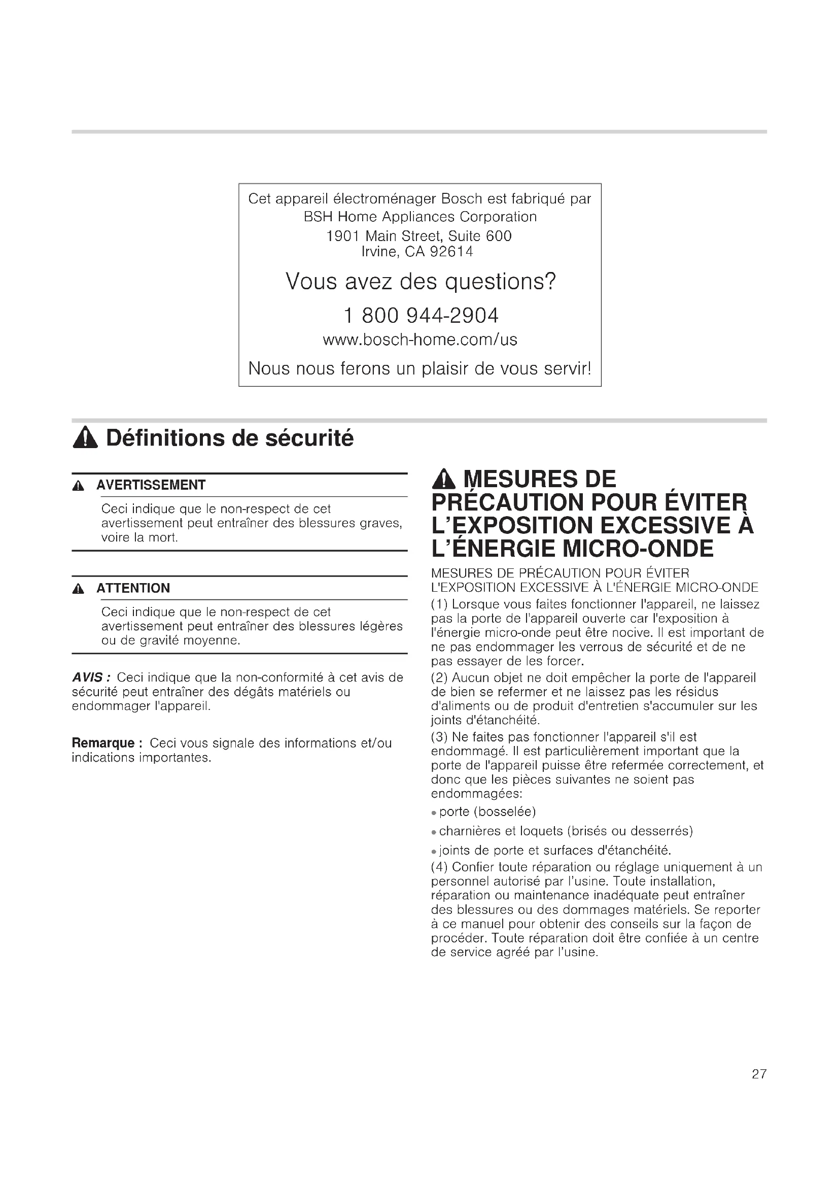 MESURES DE PRÉCAUTION POUR ÉVITER L'EXPOSITION EXCESSIVE À L'ÉNERGIE MICRO-ONDE(1) Lorsque vous faites fonctionner l'appareil, ne laissezpas la porte de l'appareil ouverte car l'exposition àl'énergie micro-onde peut être nocive. Il est important dene pas endommager les verrous de sécurité et de nepas essayer de les forcer. (2) Aucun objet ne doit empêcher la porte de l'appareil de bien se refermer et ne laissez pas les résidus d'aliments ou de produit d'entretien s'accumuler sur les joints d'étanchéité. (3) Ne faites pas fonctionner l'appareil s'il est endommagé. Il est particulièrement important que laporte de l'appareil puisse être refermée correctement, etdonc que les pièces suivantes ne soient pasendommagées:▯ porte (bosselée)▯ charnières et loquets (brisés ou desserrés)▯ joints de porte et surfaces d'étanchéité.(4) Confier toute réparation ou réglage uniquement à unpersonnel autorisé par l’usine. Toute installation,réparation ou maintenance inadéquate peut entraînerdes blessures ou des dommages matériels. Se reporterà ce manuel pour obtenir des conseils sur la façon deprocéder. Toute réparation doit être confiée à un centrede service agréé par l’usine. Vous avez des questions? www.bosch-home.com/us 1800944-2904 Nous nous ferons un plaisir de vous servir! Cet appareil électroménager Bosch est fabriqué par BSH Home Appliances Corporation 1901 Main Street, Suite 600 Irvine, CA 92614 CONSIGNES DE SÉCURITÉ IMPORTANTES LISEZ TOUTES LES INSTRUCTIONS AVANT D'UTILISER L'APPAREIL